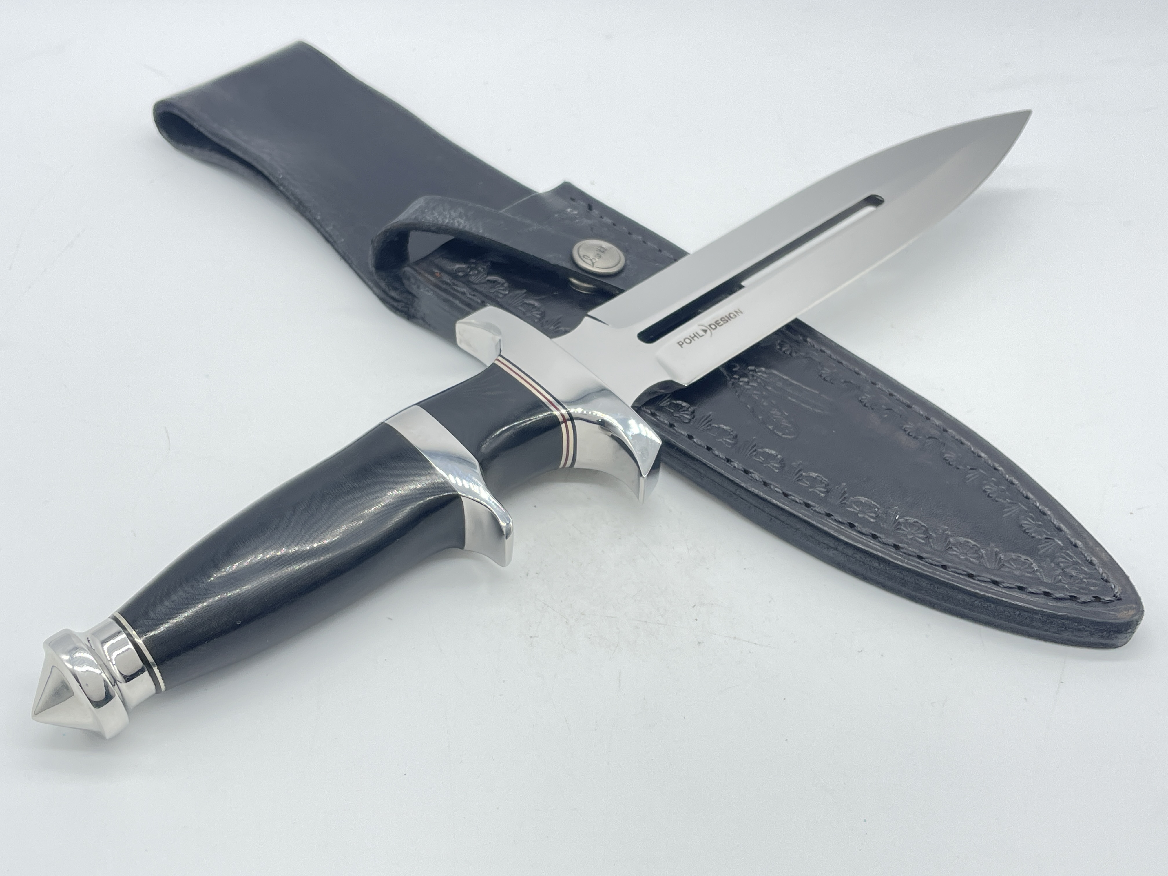 Rare!!! #3 of 3 made! This dagger designed by Dietmer Pohl that Gil made but he made an error. Dietmer wanted a groove in the blade and Gil thought it was a through and through grove. 17.2 ounces. 13-5/8 inches overall. 7-3/4 inch blade. 3/16 inch thick. Made in USA. Stainless steel blade. Front Ricasso: HIBBENKNIVES LA GRANGE, KY (Gil Hibben's signature). Black G10 handle. Stainless Steel guard and pommel.