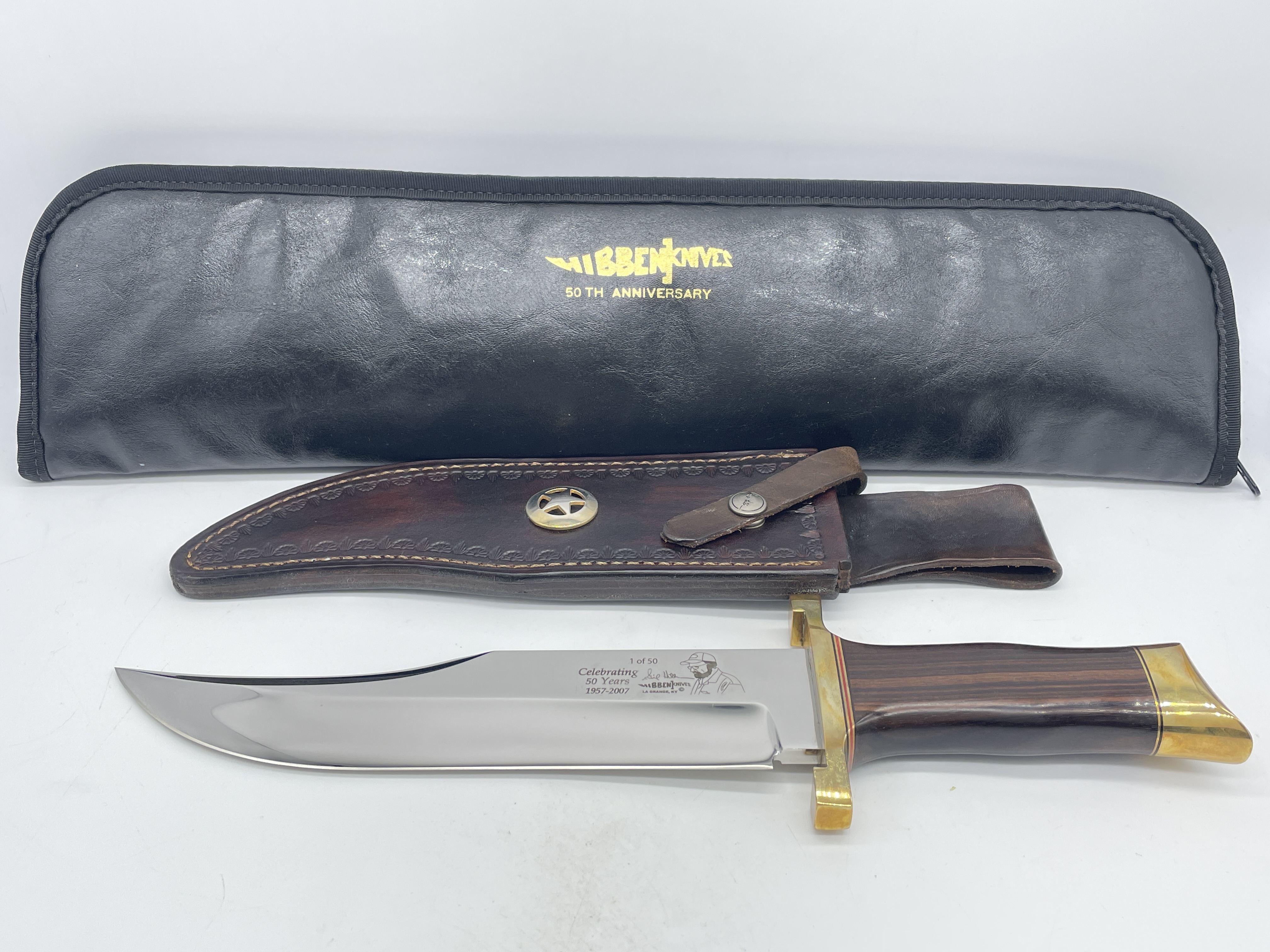 Rare!!! 1 of 50 made! 30.8 ounces. 15 inches overall. 8-5/8 inch blade. 5/16 inch thick. Made in USA. Stainless steel blade. Front Blade etch: 1 of 50 Celebrating 50 Years 1957-2007 (Gil Hibben's signature) HIBBENKNIVES LA GRANGE, KY (portrait of Gil). Wood handle. Brass guard and pommel.
