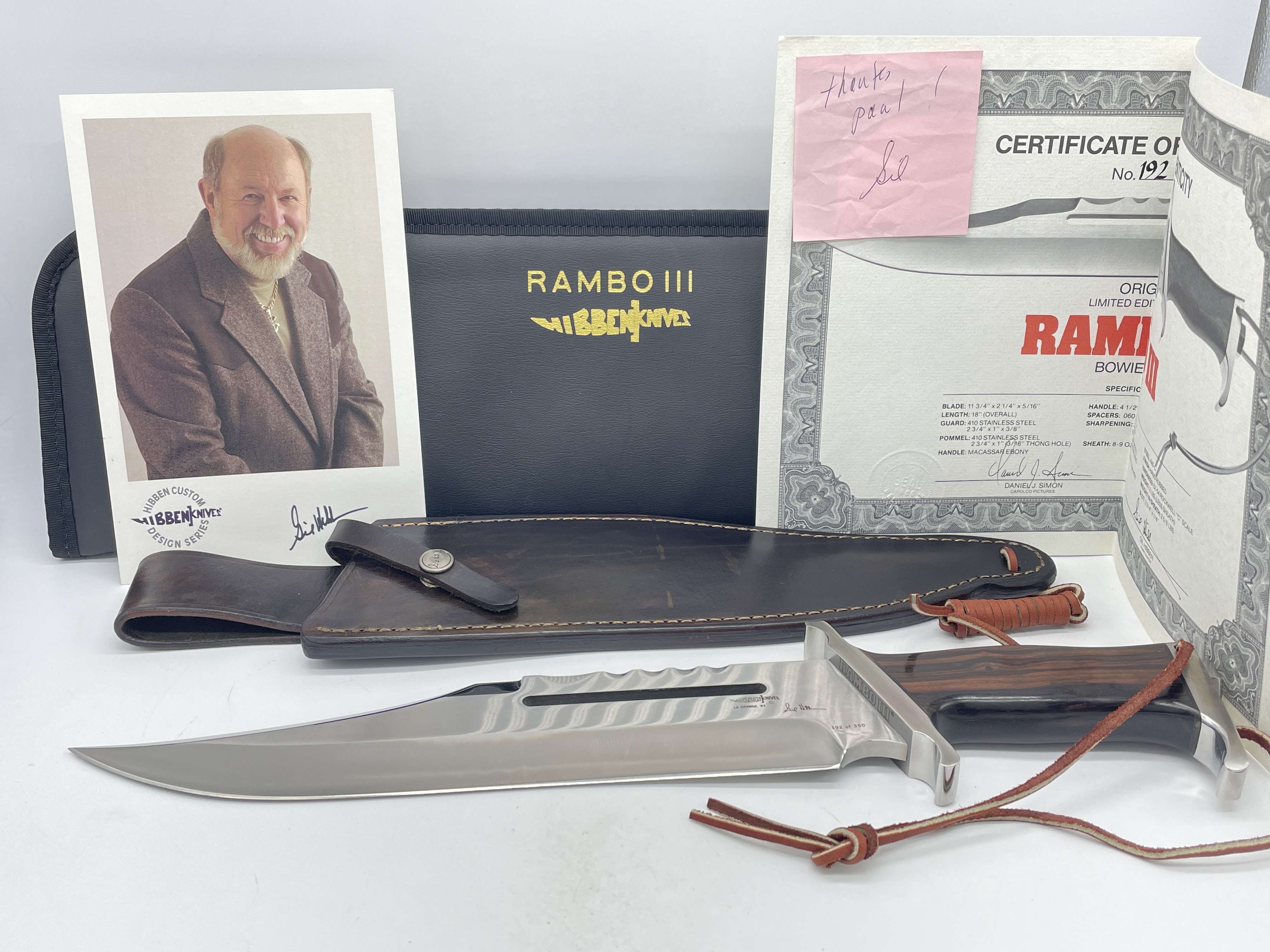 Rare!!! #192 of 350 made! 37.8 ounces. 17 inches overall. 11-3/4 inch blade. 5/16 inch thick. Made in USA. Stainless steel blade. Front Blade etch: HIBBENKNIVES LA GRANGE, KY (Gil Hibben's signature) 192 of 350. Macassar Ebony Wood handle. Stainless Steel guard and pommel. Guard etch: RAMBO III (Gil Hibben's signature).