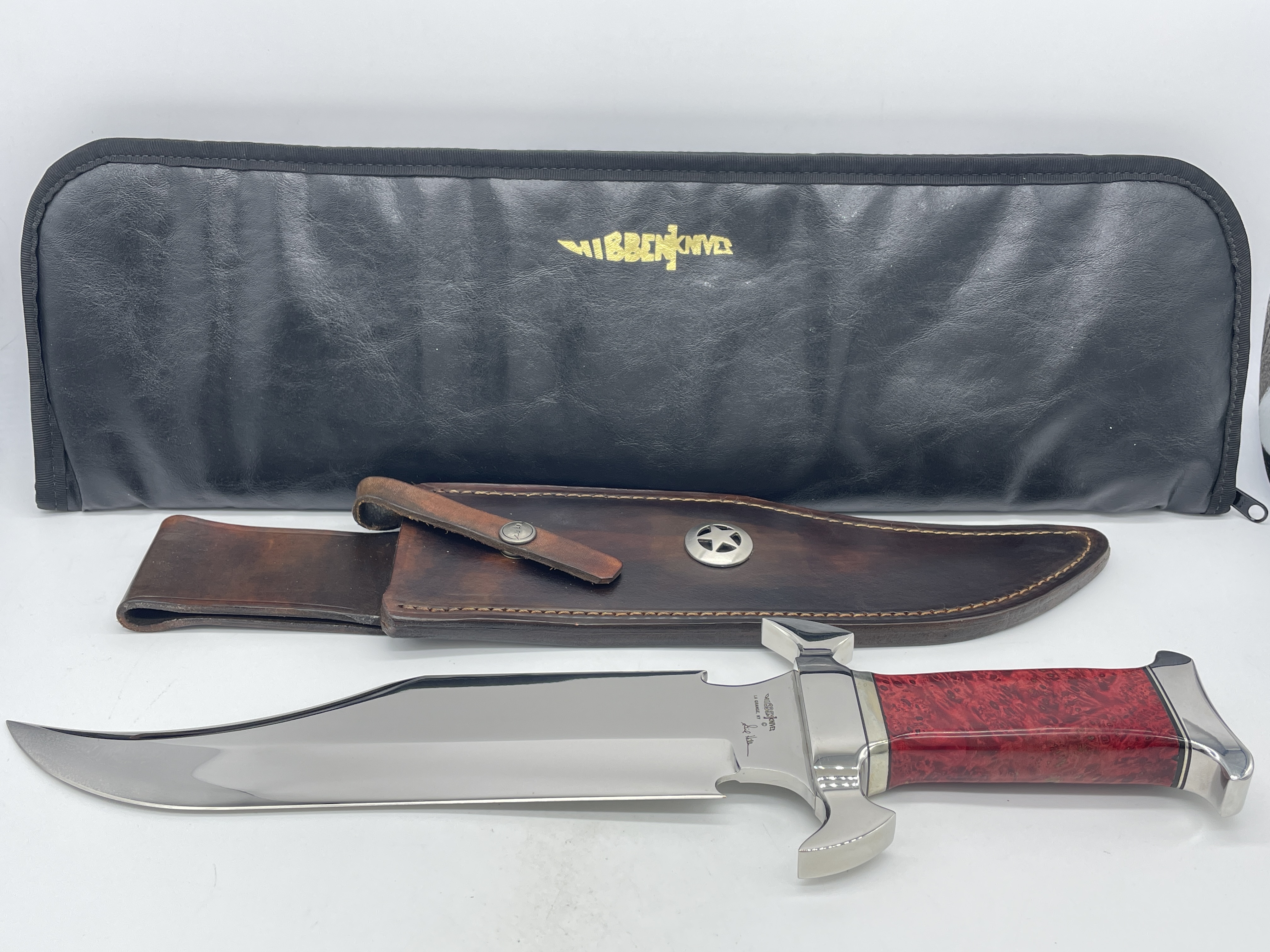 Rare!!! This knife is the 3rd one made! 40.3 ounces. 16-1/2 inches overall. 11 inch blade. 1/4 inch thick. Made in USA. Front Ricasso: HIBBENKNIVES LA GRANGE, KY (Gil Hibben's signature). Stainless steel blade. Red Stabilized Wood handle. Stainless Steel guard and pommel.