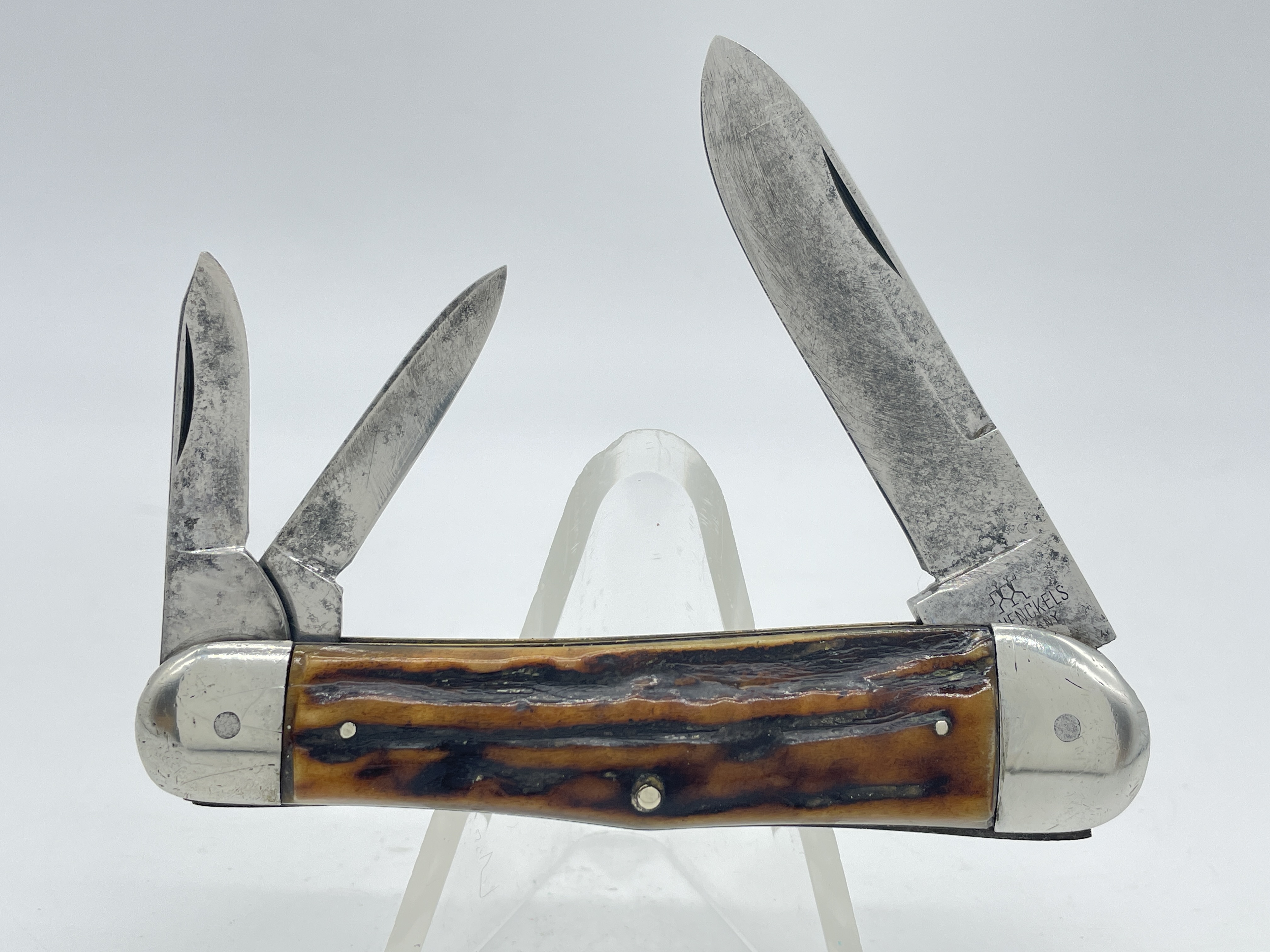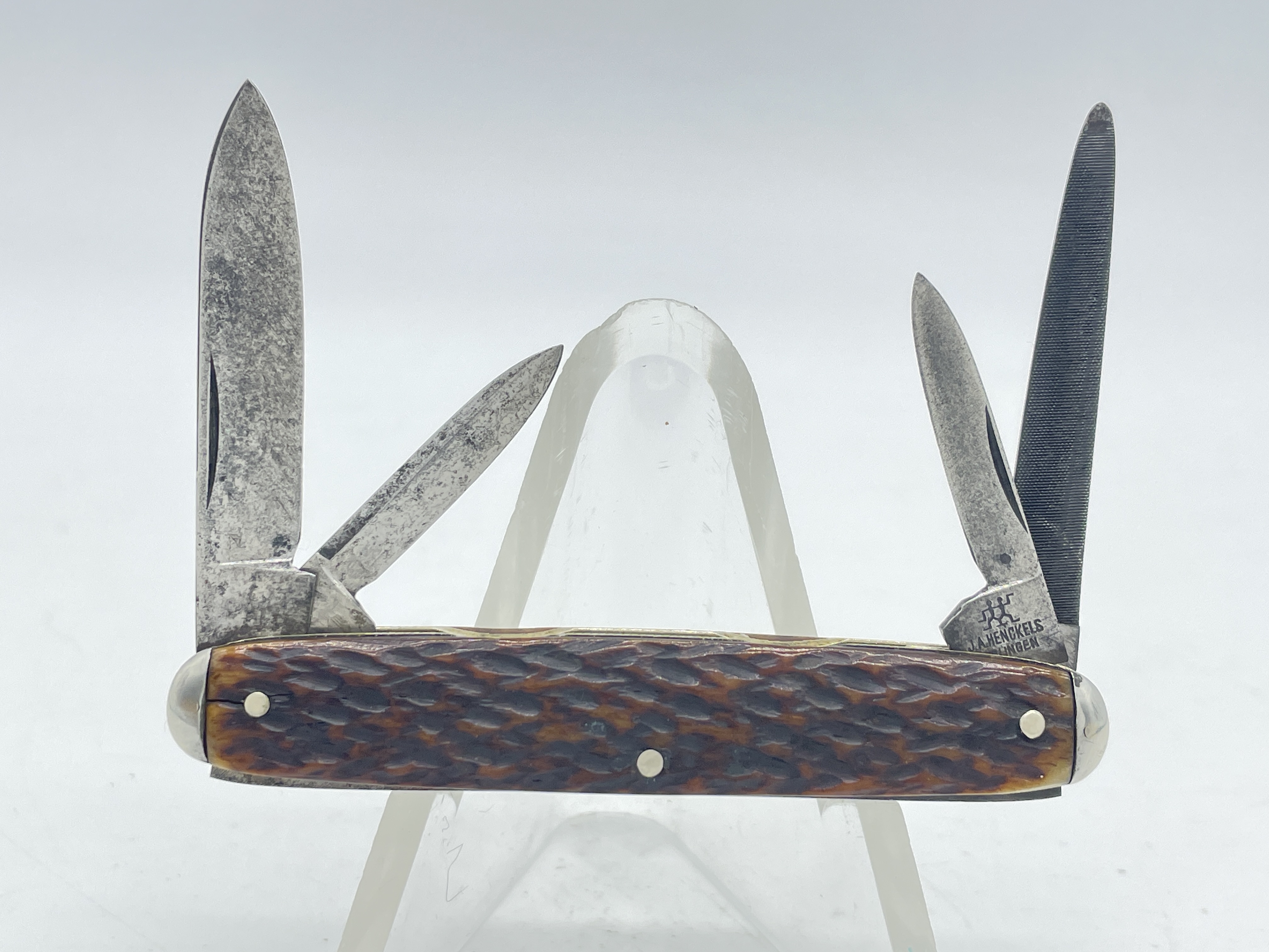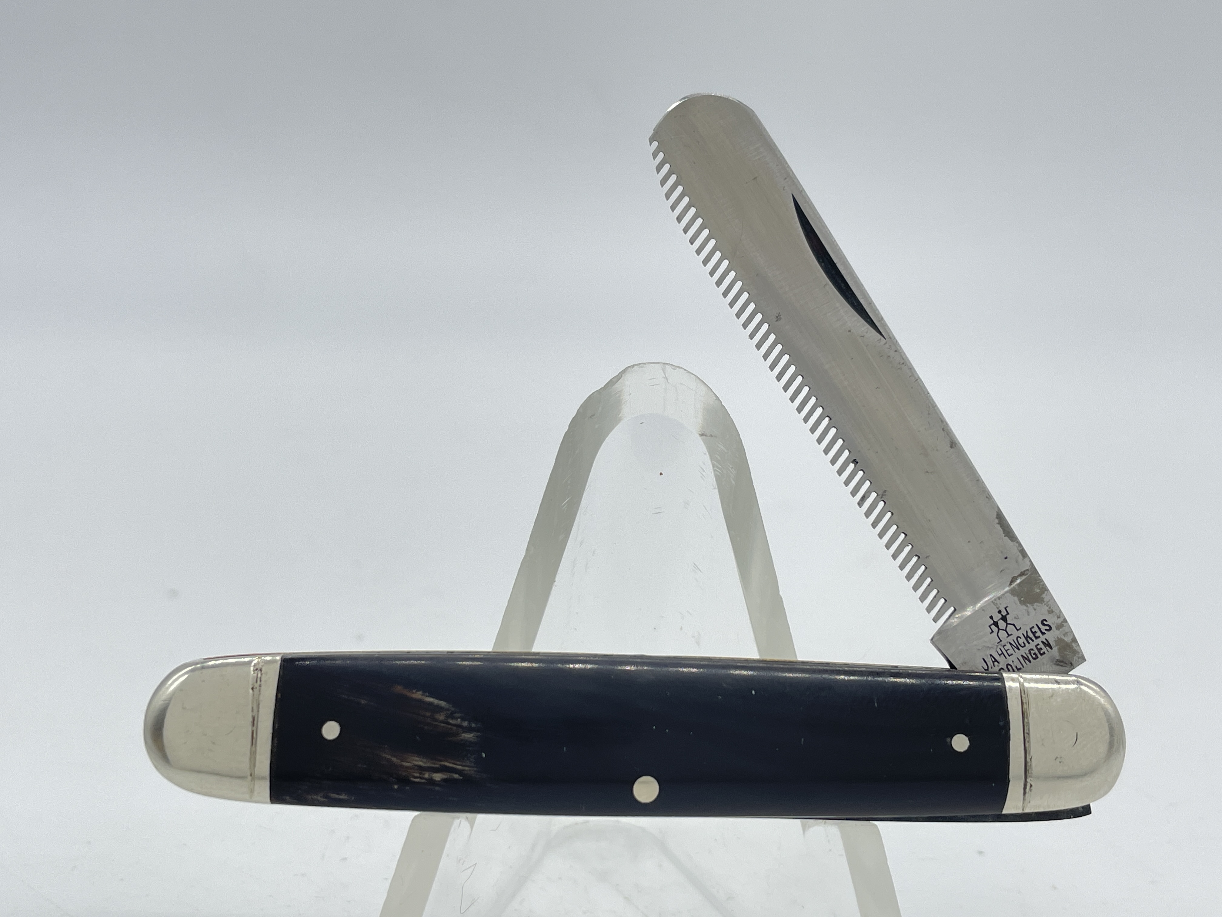 2-7/8 inches closed. 4-1/2 inch open. Made in Germany. Front Tang Blade 4: (Gemini Twins Logo) J.A. HENCKELS GERMANY ; Front Tang Blade 2 & 3: (Gemini Twins Logo) J.A. HENCKELS SOLINGEN. Steel blade. Brown Jigged Bone handle. Nickel Silver bolsters and liner.