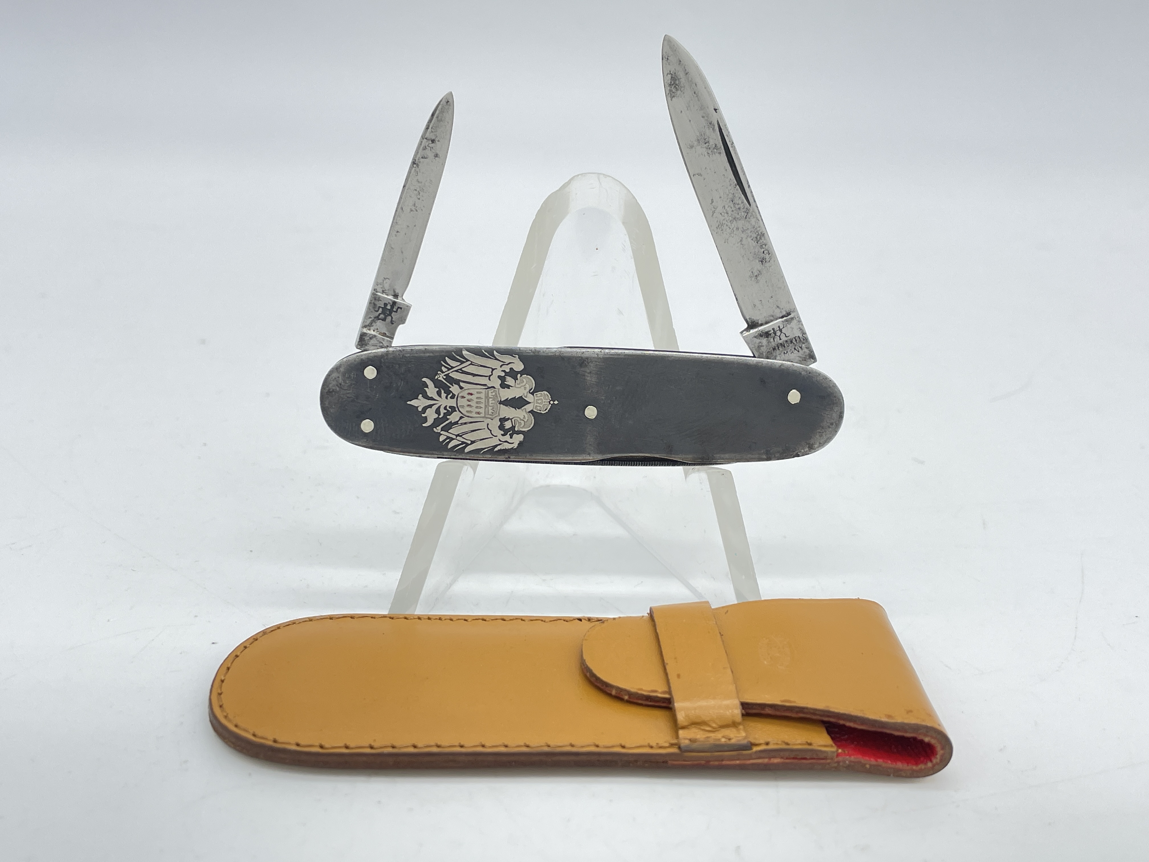 2-7/8 inches closed. 4-5/8 inch open. Made in Germany. Front Tang Blade 1: (Gemini Twins Logo) J.A. HENCKELS GERMANY ; Rear Tang Blade 2: (Gemini Twins Logo) ; Front Tang file: (Gemini Twins Logo) J.A. HENCKELS SOLINGEN. Austrian Empire Coat of Arms shield. Steel blades. Steel handle.