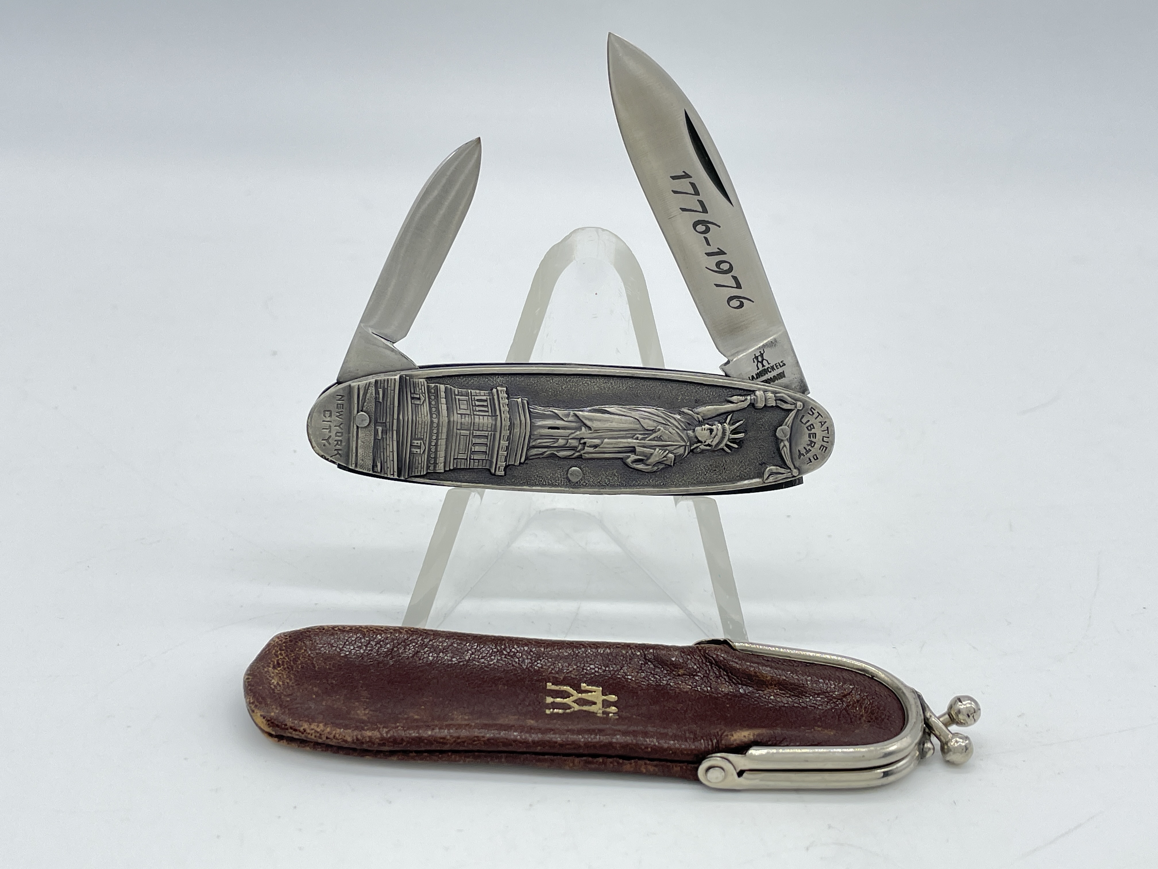 3-1/8 inches closed. 5-1/4 inch open. Made in Germany. Front Tang Blade 1: (Gemini Twins Logo) J.A. HENCKELS GERMANY ; Rear Tang Blade 1: 0477. Steel blades. Front blade 1 etch: 1776-1976. Steel handle. Front handle: Statue of Liberty / New York City ; Rear handle: N.Y. City / Washington Arch.