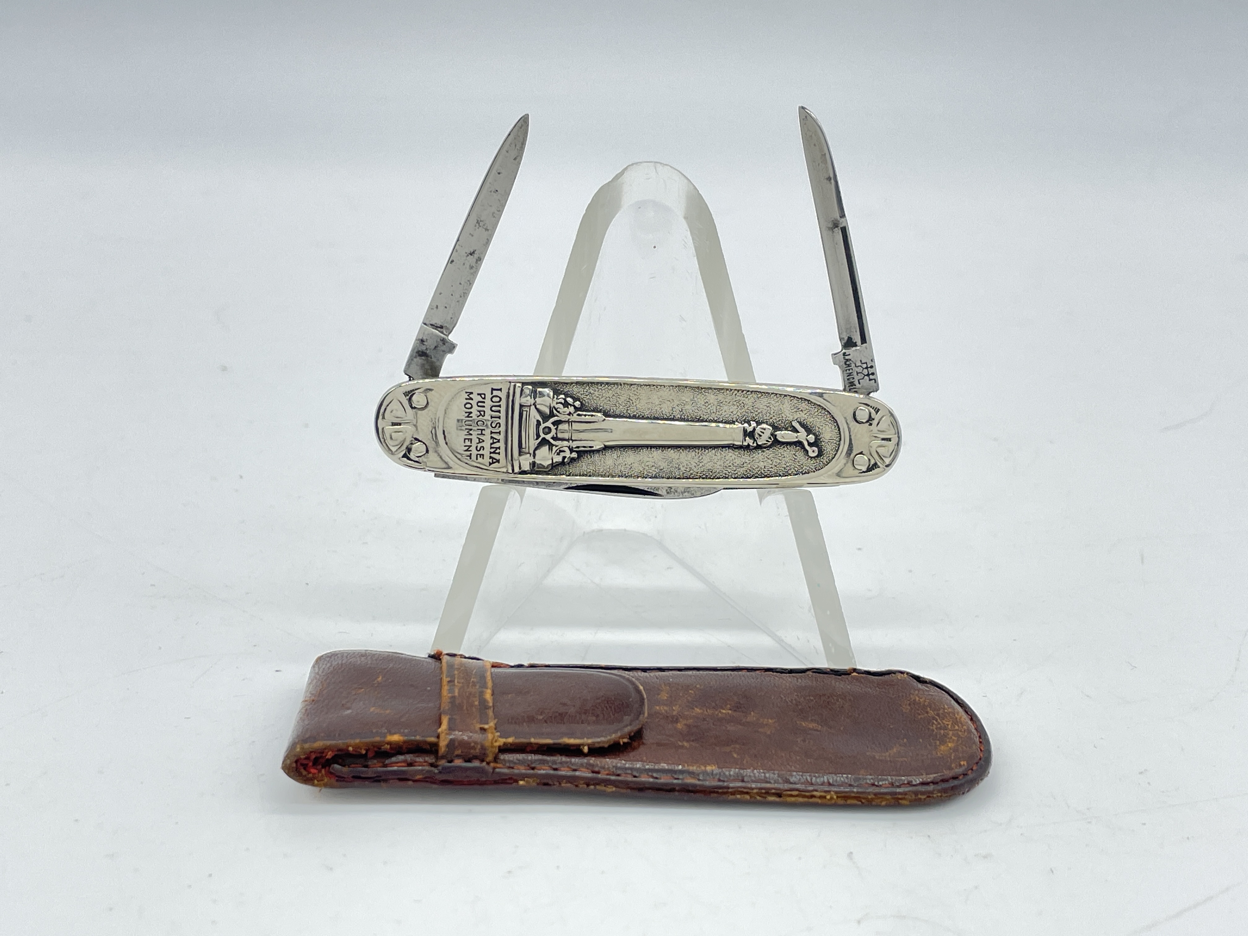 2-1/2 inches closed. 3-7/8 inch open. Made in Germany. Front Tangs Blades 1, 2, & 4: (Gemini Twins Logo) J.A. HENCKELS ; Front Tangs Blade 3: (Gemini Twins Logo) GERMANY ; Rear Tang Blade 1: GERMANY. Steel blades. Nickel Silver handle. Front handle: LOUISANA PURCHASE MONUMENT ; Rear handle: THE WORLD'S FAIR AT ST. LOUIS 1904. Nickel Silver liner.