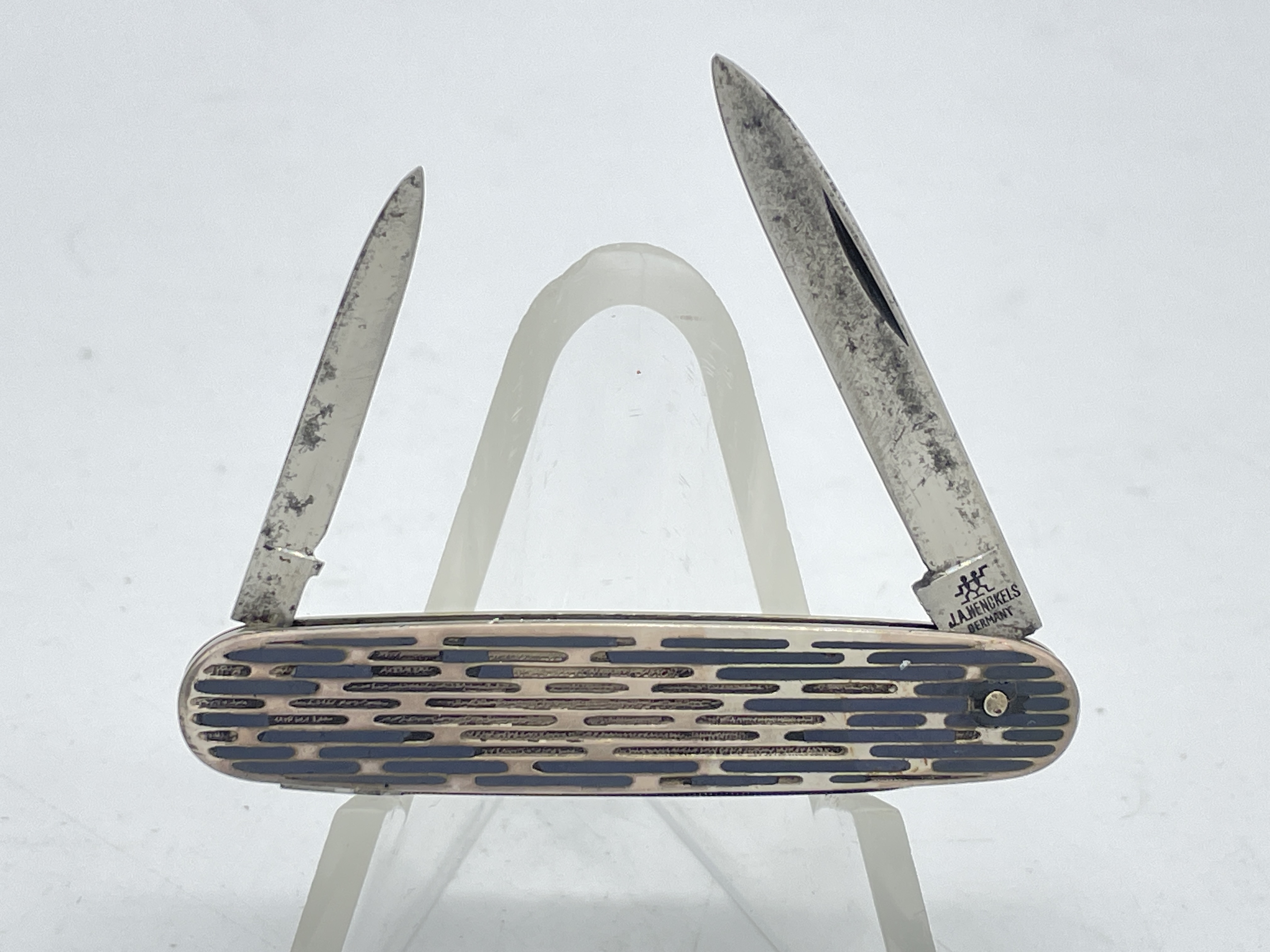 4 inches closed. 6-3/4 inch open. Made in Germany. Front Tang Master blade: (Gemini Twins Logo) J.A. HENCKELS GERMANY ; Front Tang Blade 1 & 3: (Gemini Twins Logo) J.A. HENCKELS SOLINGEN. Steel blade. Genuine Stag handle. Nickel Silver bolsters. Brass liner.