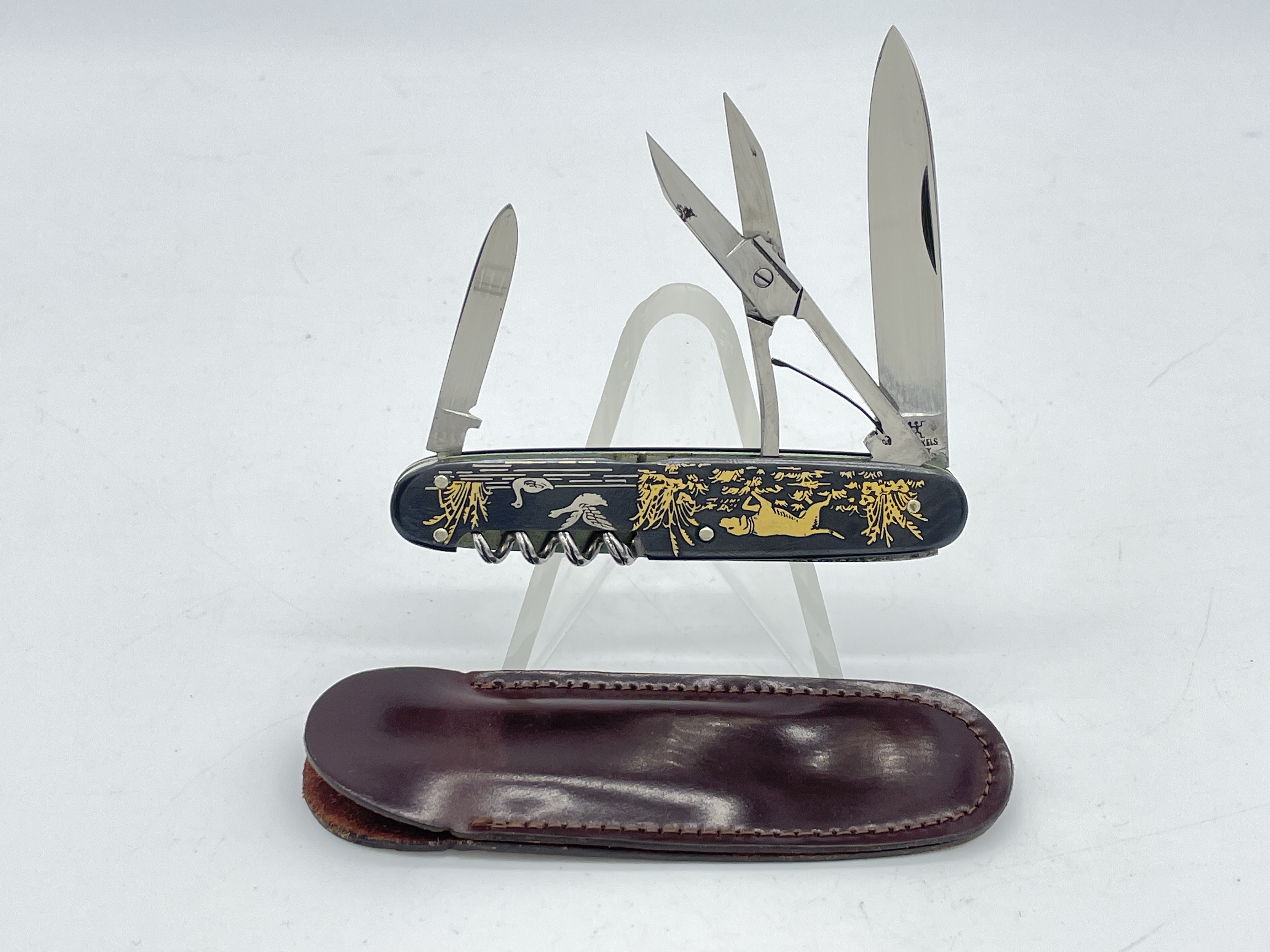 3-1/4 inches closed. 5-5/8 inch open. Made in Germany. Front Tang Blade 1: (Gemini Twins Logo) J.A. HENCKELS GERMANY ; Front Tangs Blade 2: (Gemini Twins Logo) GERMANY. Steel blades. Steel handle and liner. Front handle: Brass & Silver Overlay Duck Hunting Scene with Dog.