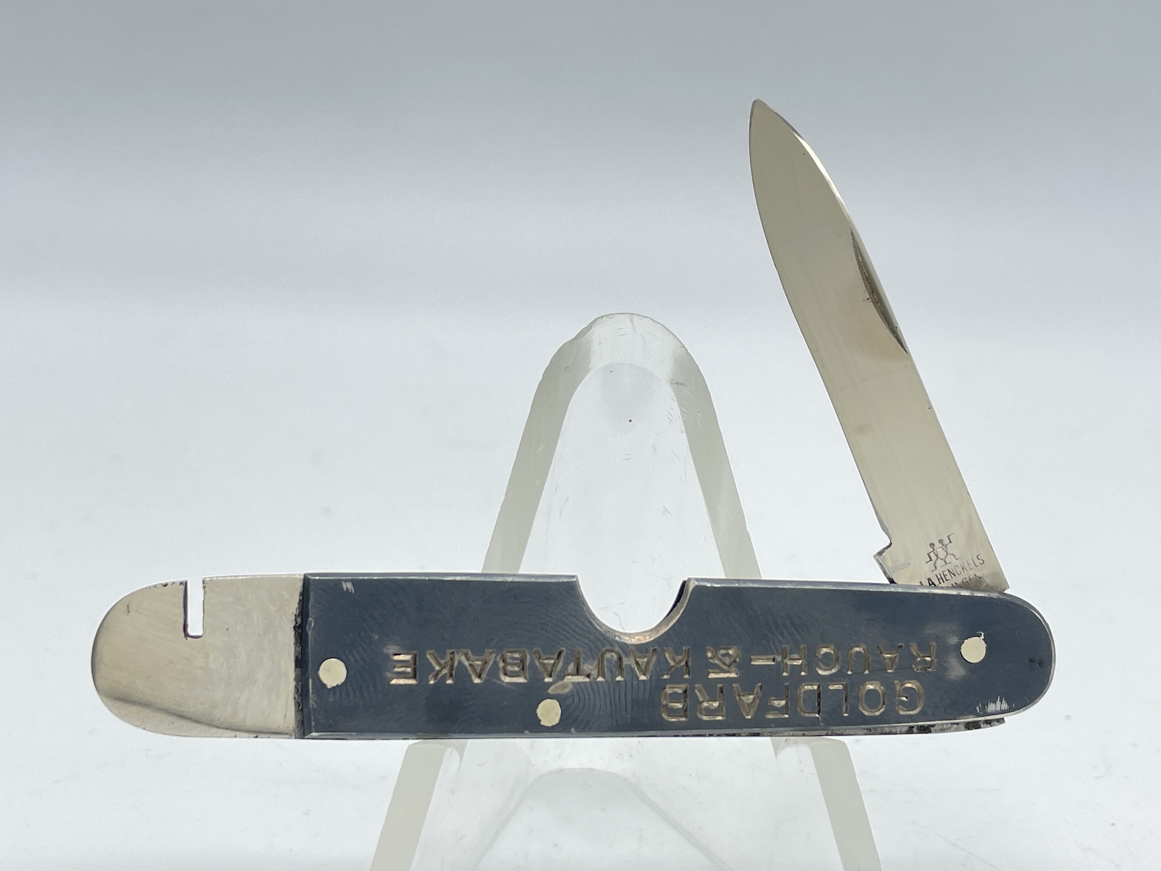3-1/2 inches closed. 5-3/8 inch open. Made in Germany. Front Tang Blade 1: (Gemini Twins Logo) J.A. HENCKELS SOLINGEN. Austrian Empire Coat of Arms shield. Steel blade. Steel handle. Front handle: GOLDFARB RAUCH-&KAUTABAKE. Steel pick.