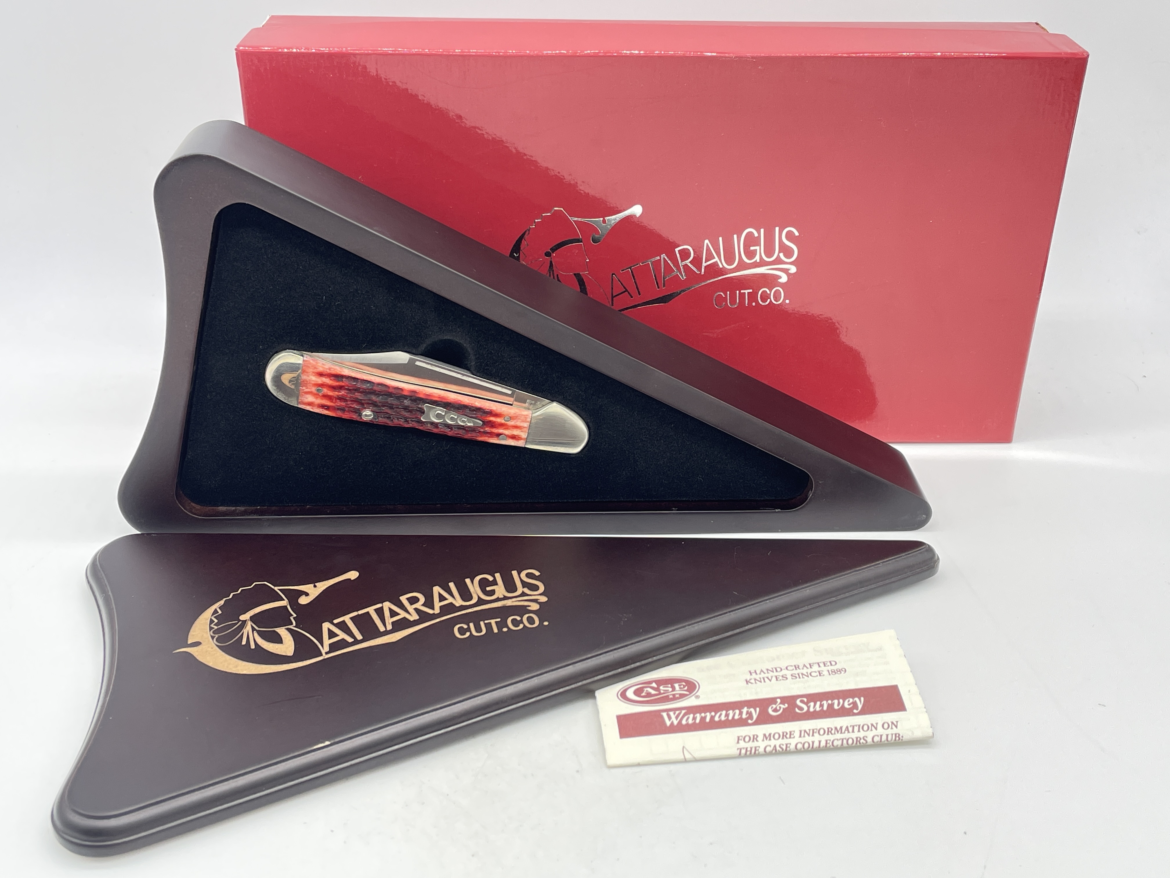 Made by Case XX. 4-1/4 inches closed. 7-1/2 inches open. Made in USA. Front Tang: Cattaraugus Cut. Co. 61549L ATS-34. Arrowhead CCCo. shield. ATS-34 Stainless Steel blades. Tested Red Jig Bone handle. Nickel Silver bolsters. Brass liner.