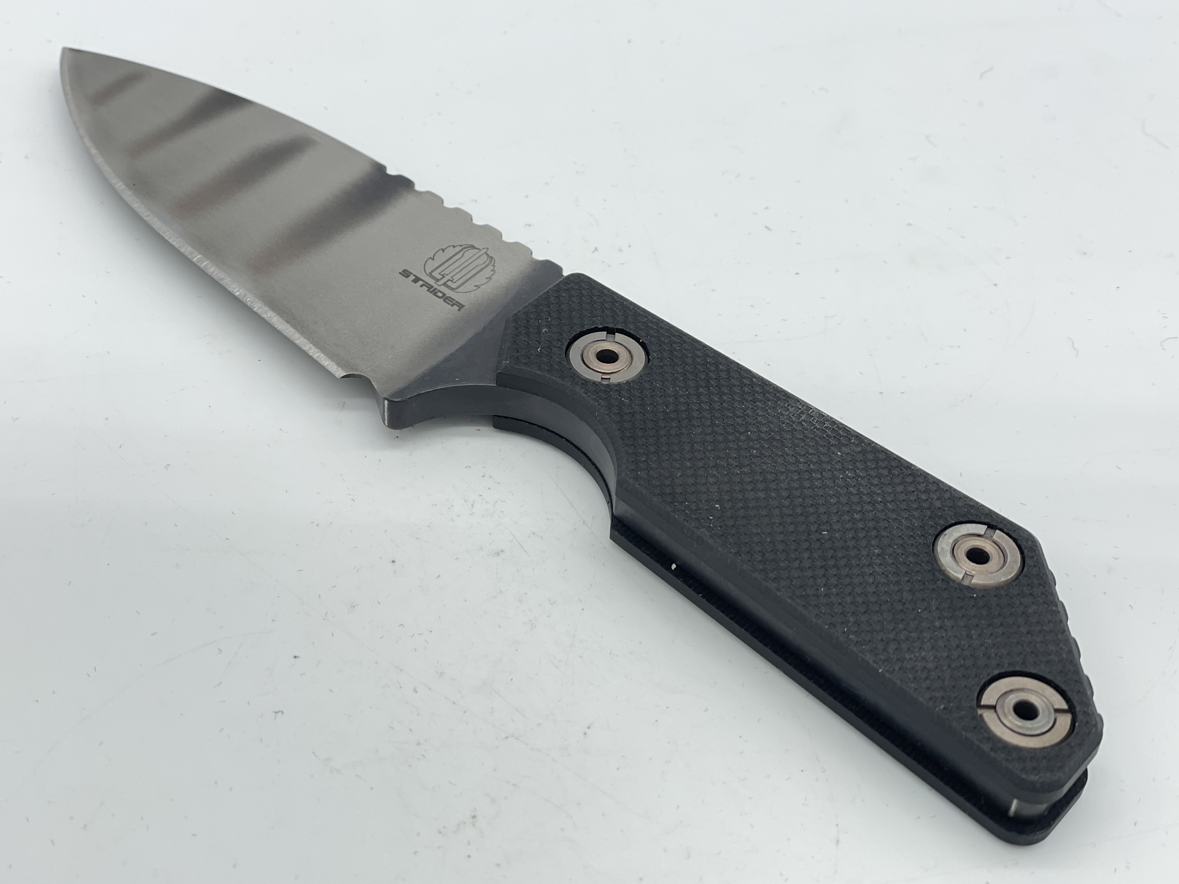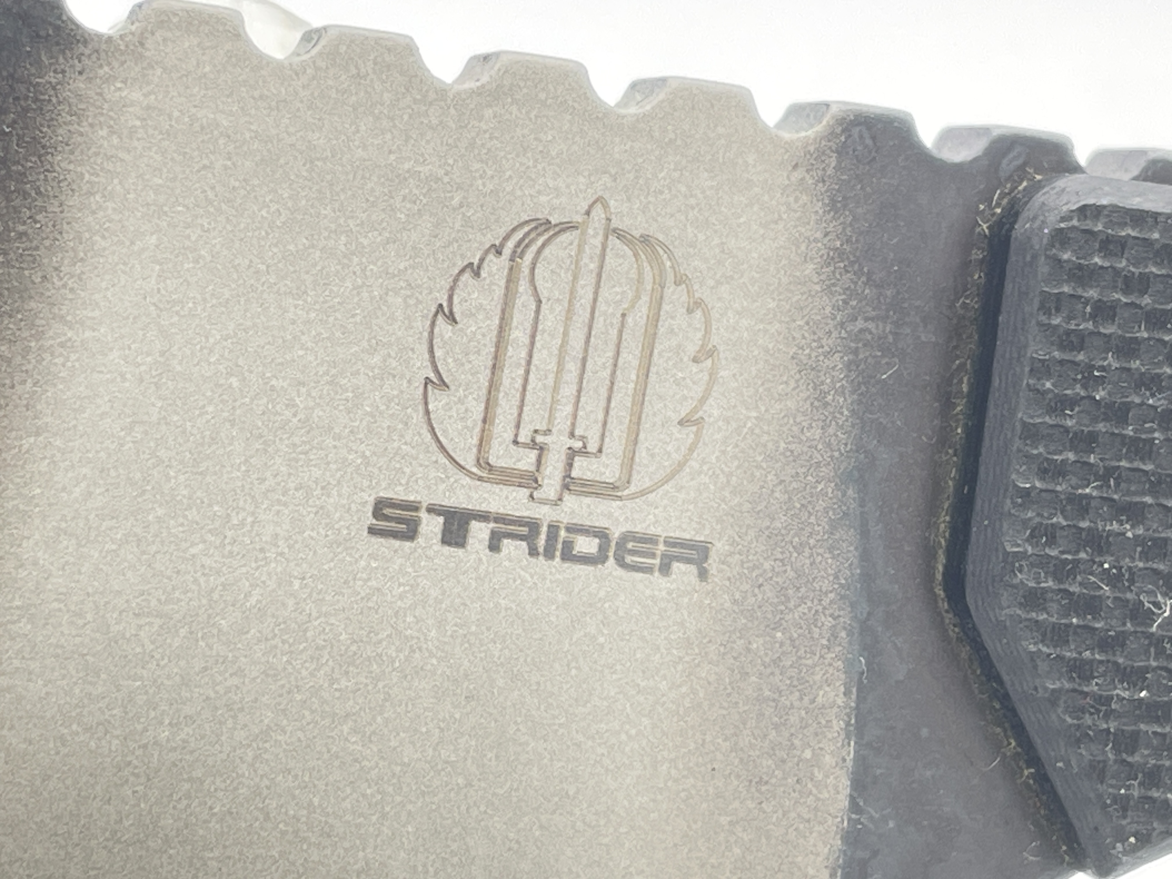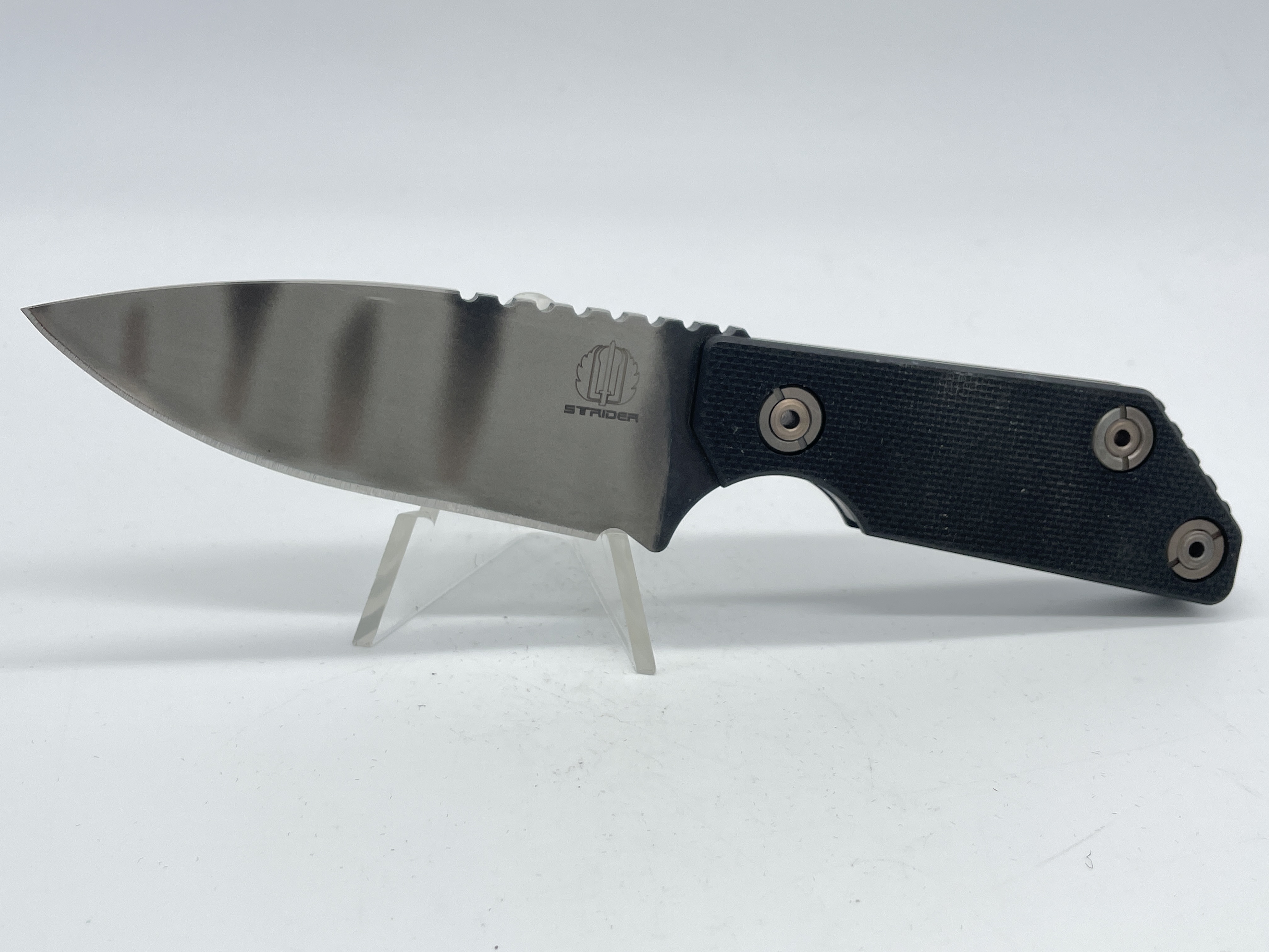 8.8 ounces. 8-1/2 inches overall. 4-1/4 inch blade. 1/4 inch thick. Made in USA. Tiger Stripe Steel blade. Front blade etch: (logo) STRIDER. Black G10 handle.