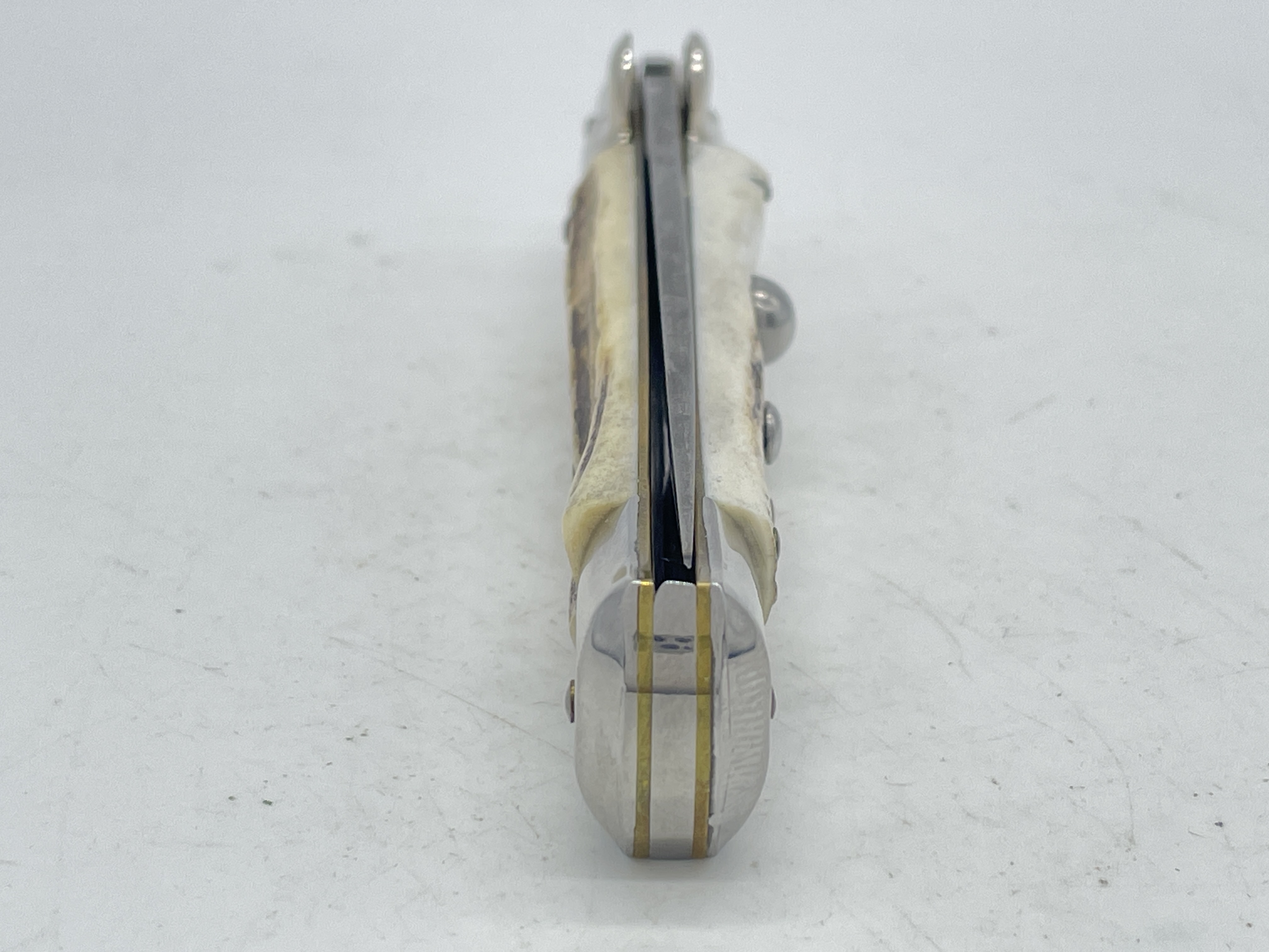 5 inches closed. 8-7/8 inches open. Made in Italy. Front Tang: AB ITALY. Stainless Steel blades. Genuine Stag handle. Nickel Silver bolsters. Brass liner. Steel push button and safety.