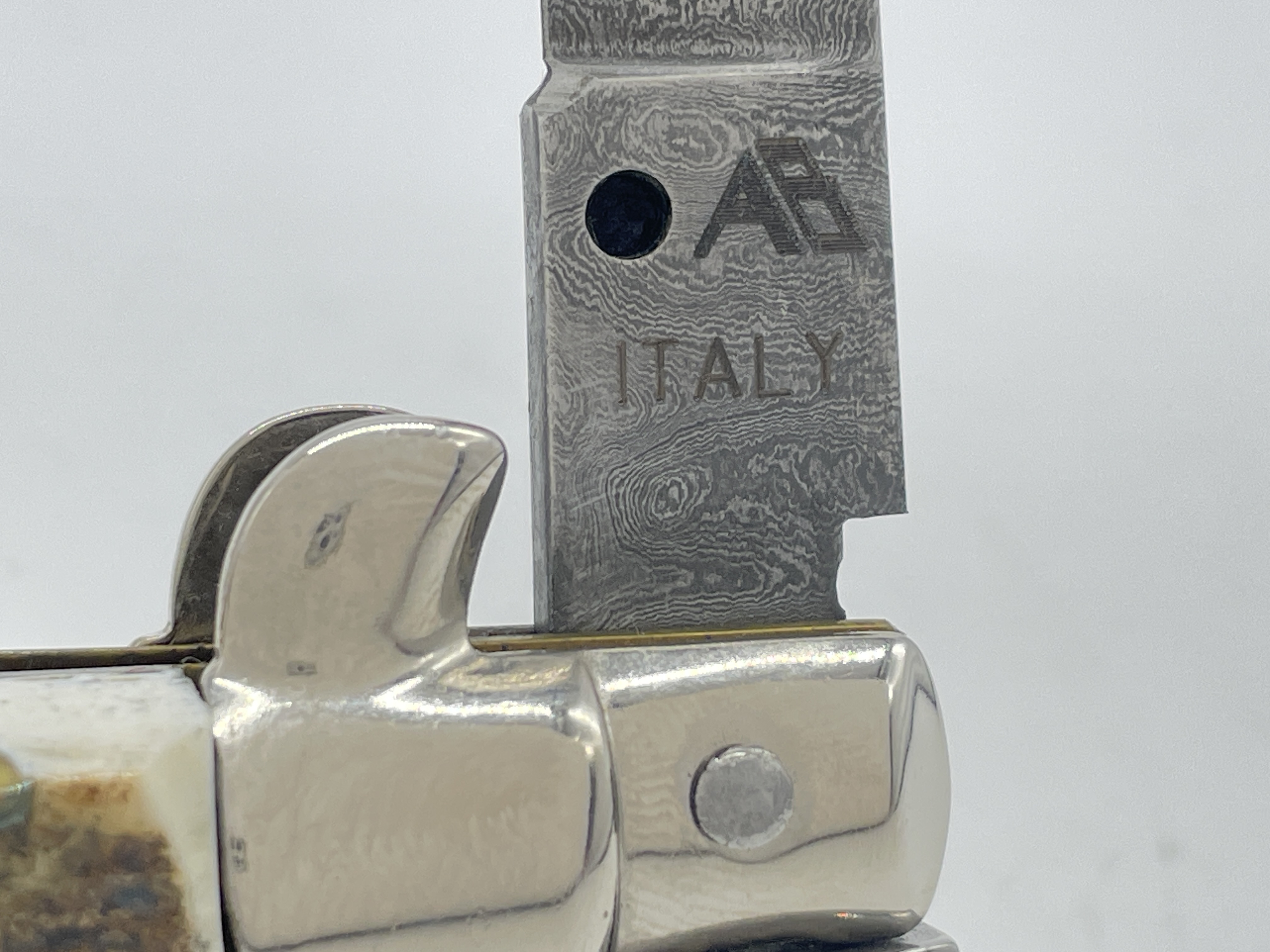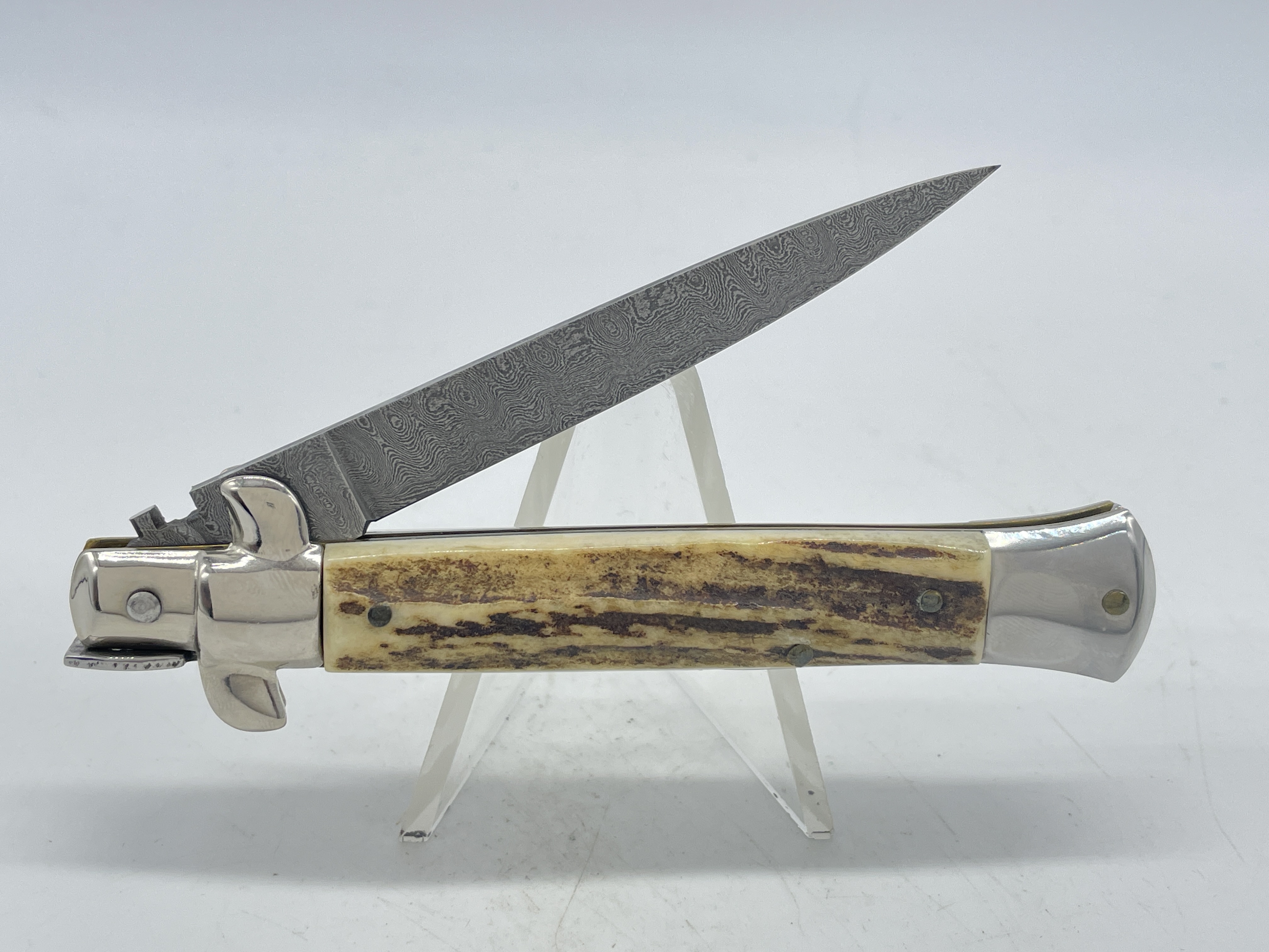 AB ITALY Genuine Stag Bolster Lock Damascus Stiletto Push Button Automatic