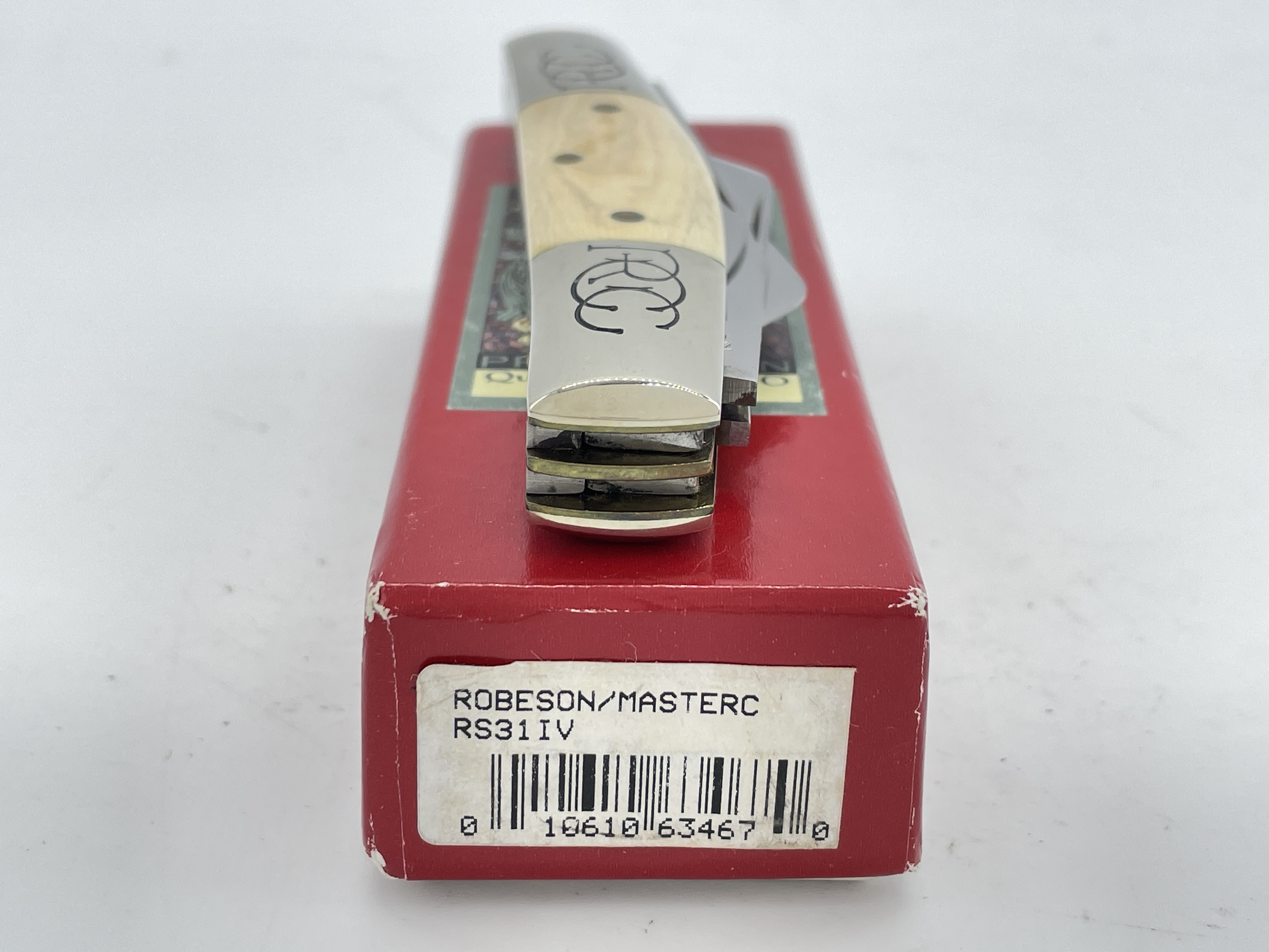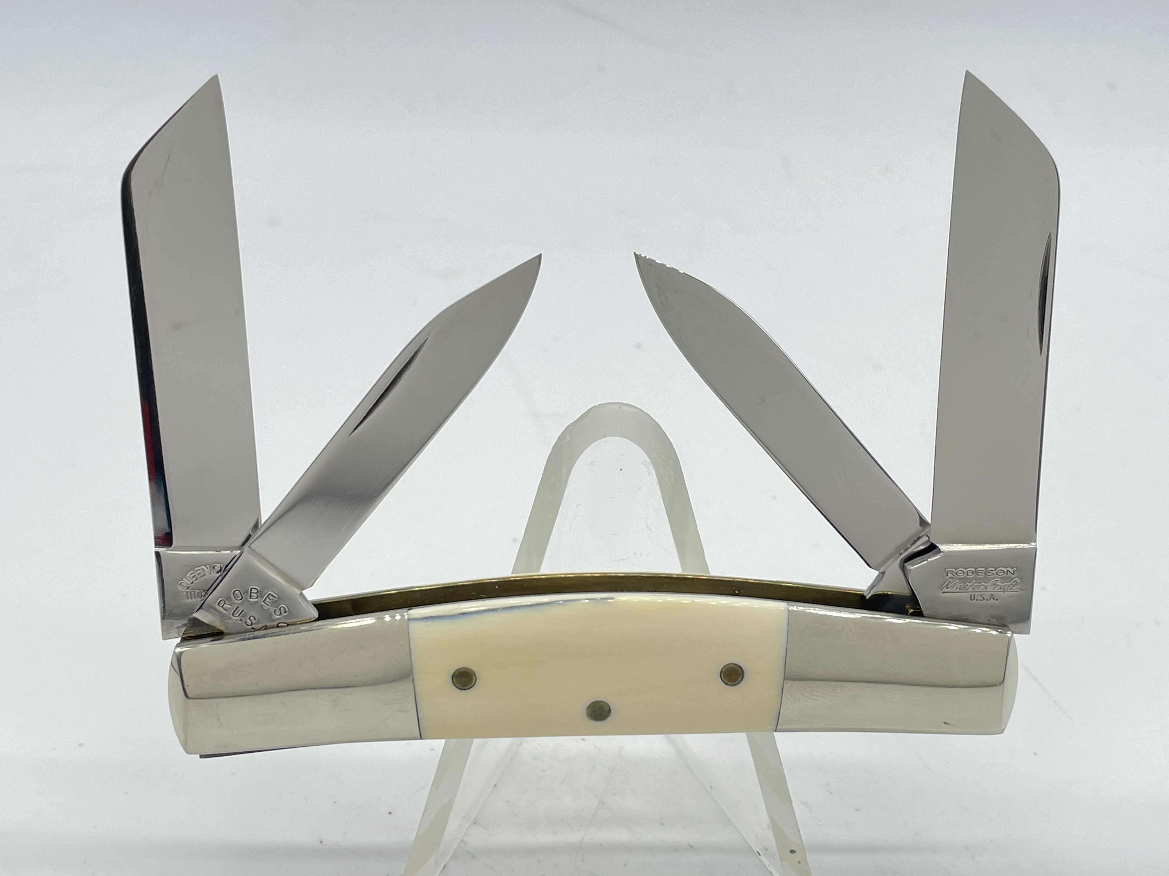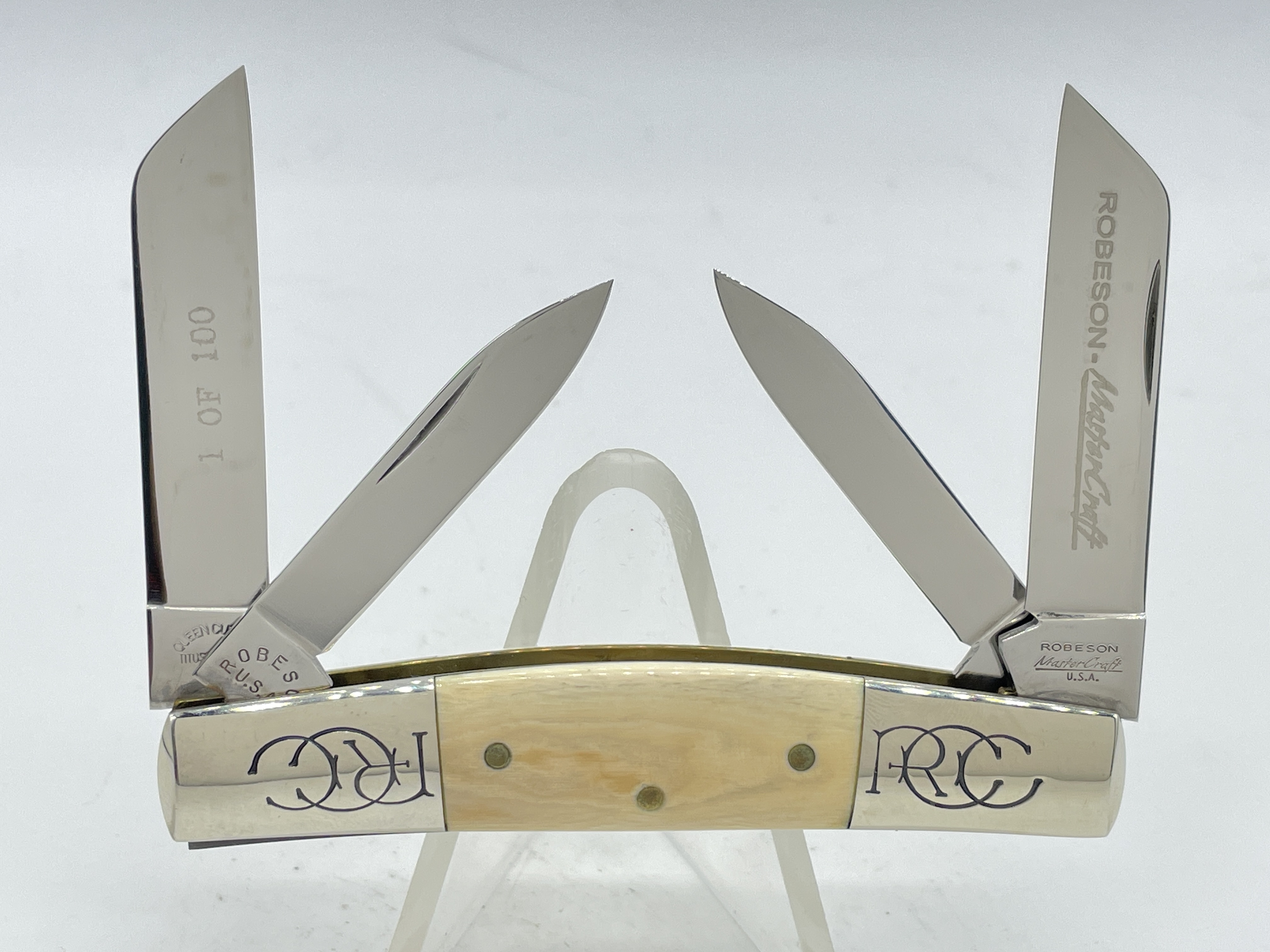 Limited Edition 1 of 100. 4 inches closed. 6-5/8 inches open. Made in USA. Front tangs Blade 2 & 3: Robeson ShurEdge U.S.A. ; Rear tangs Blade 2 & 3: QUEEN CUT. CO. TITUSVILLE, PA ; Front Tang Blade 1 & 4: ROBESON U.S.A. Steel blade. Master blade etch: ROBESON-MasterCraft ; Rear Blade 3 etch: 1 OF 100. Genuine Mammoth Ivory handle. Nickel Silver bolster. Bolster stamp: RCC. Brass liner.
