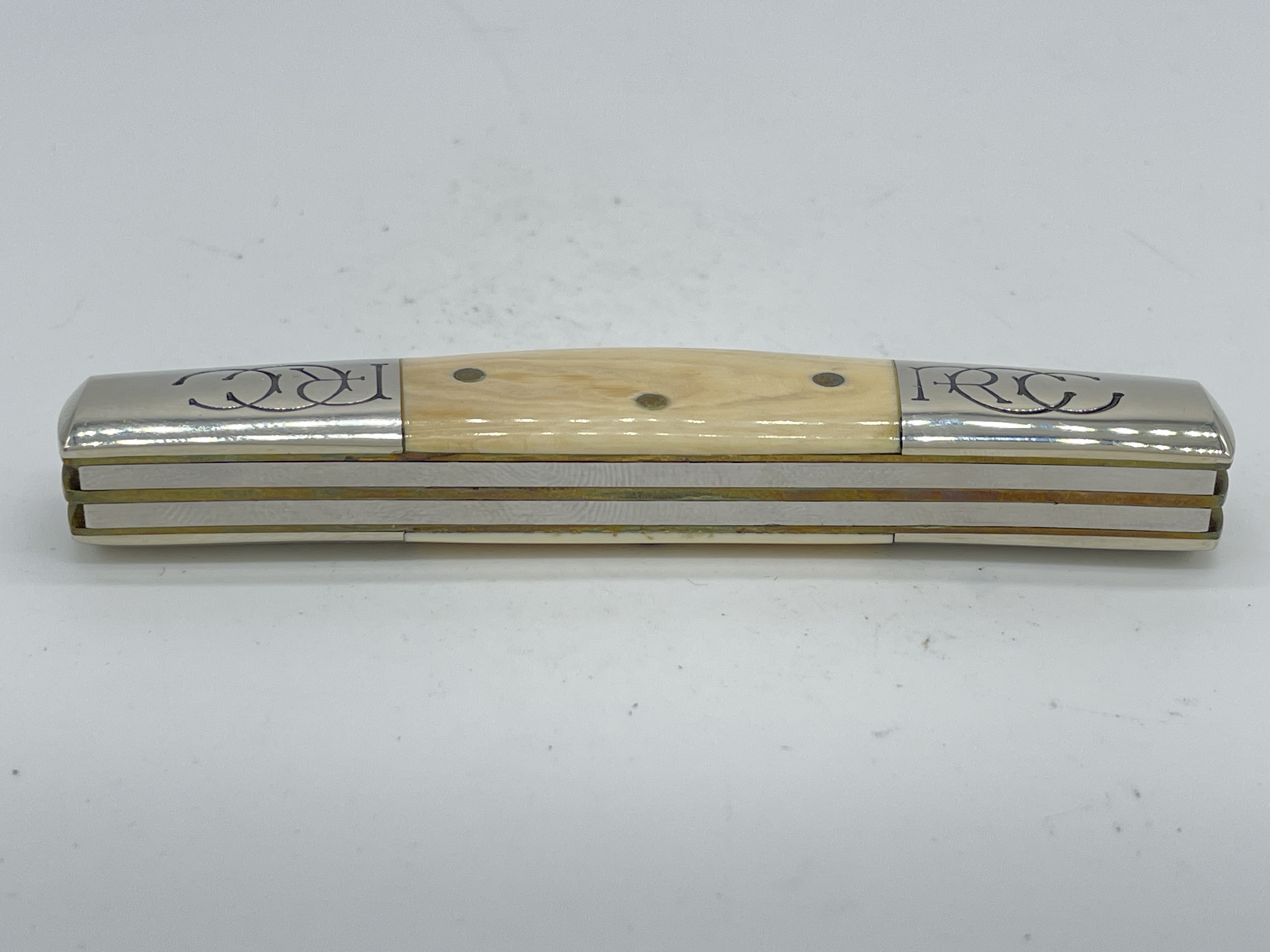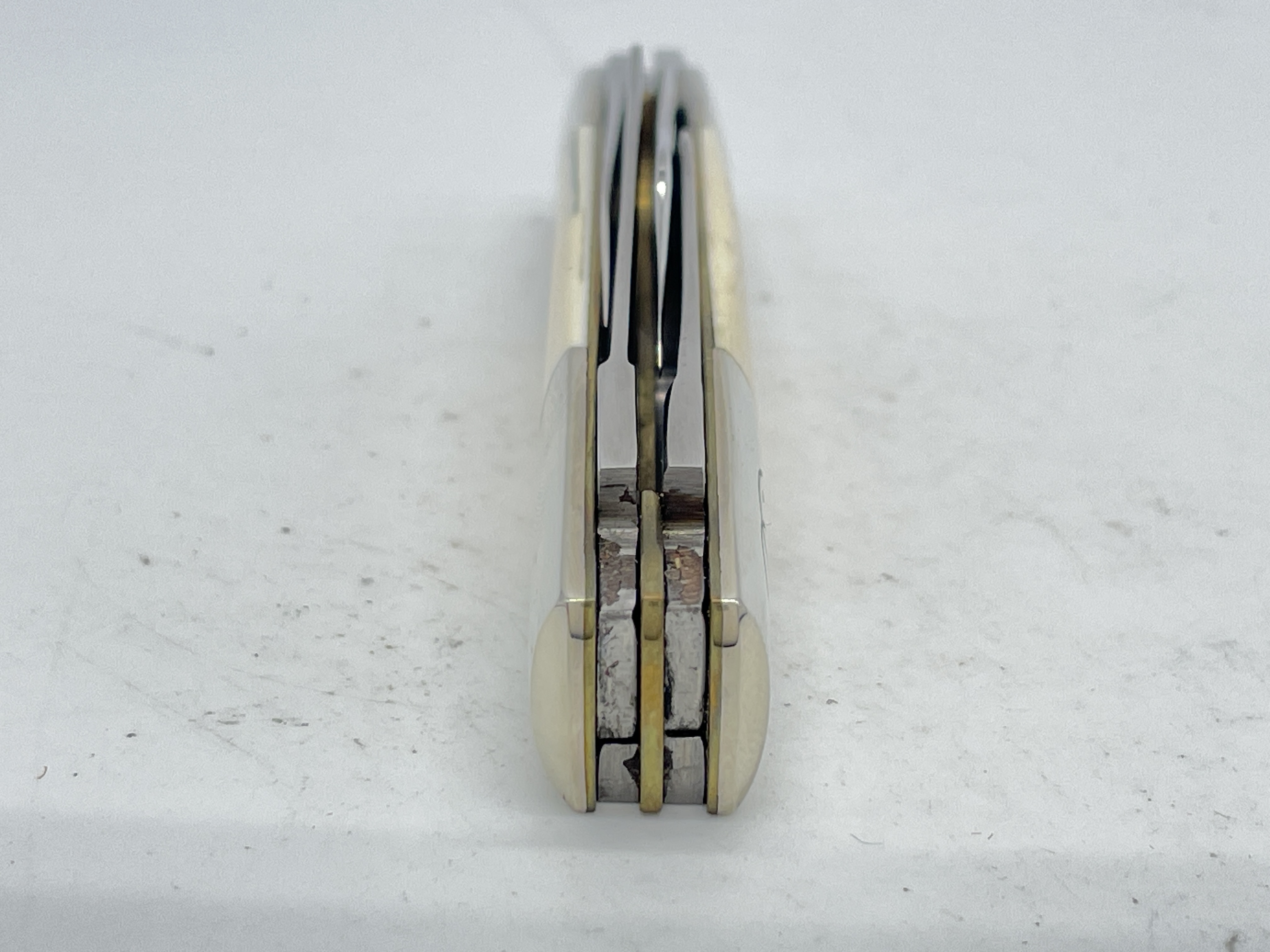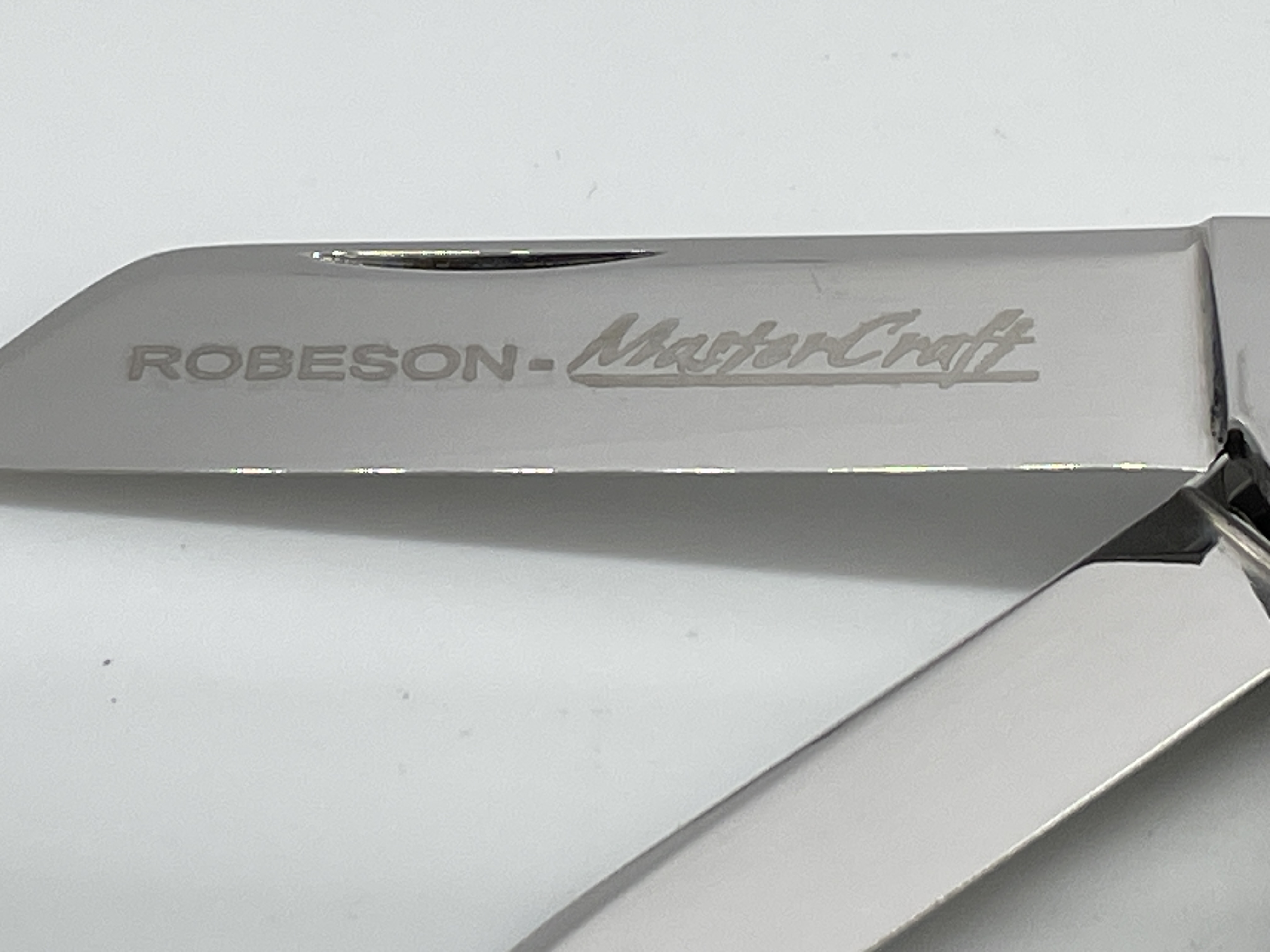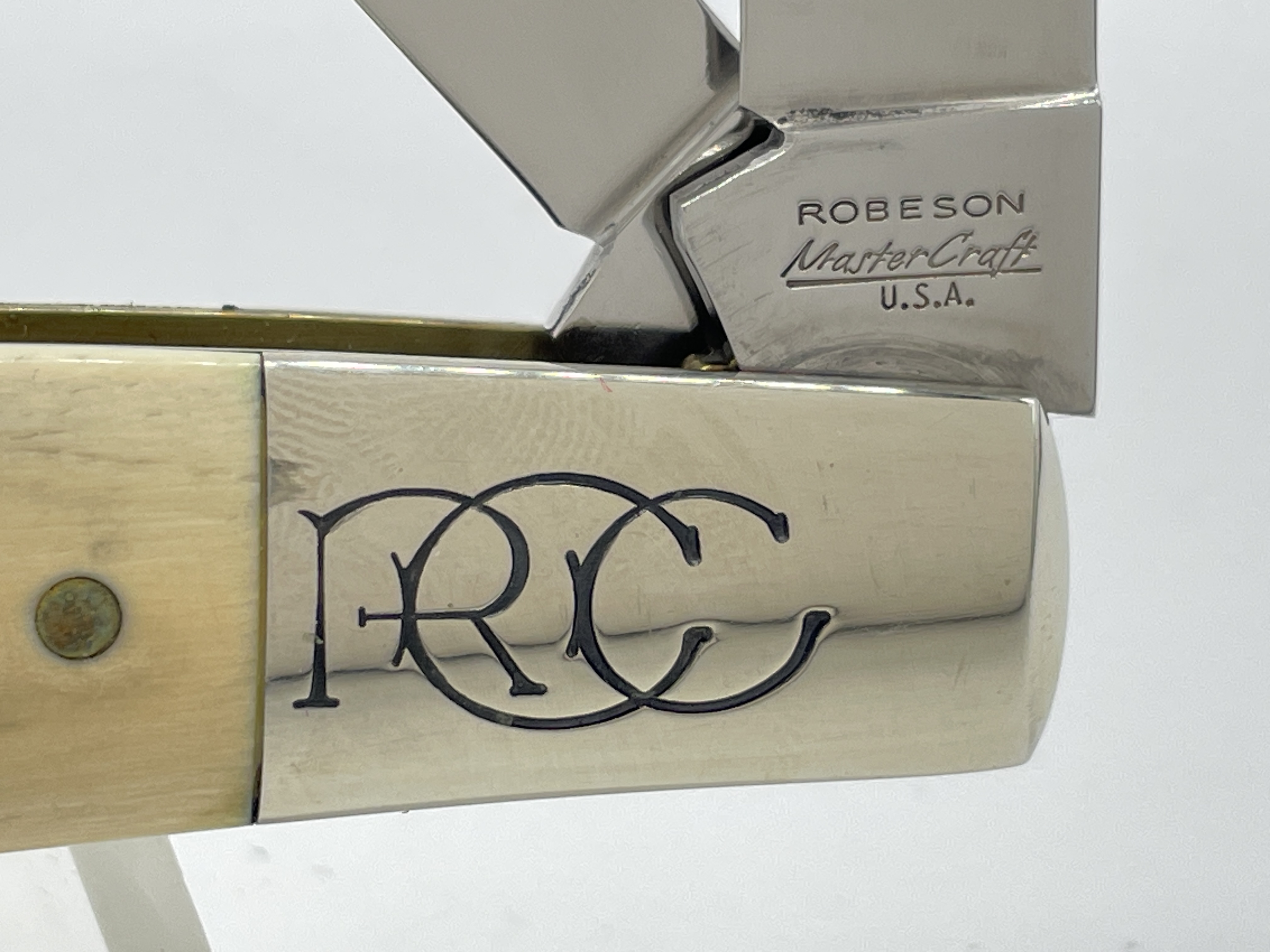 Limited Edition 1 of 100. 4 inches closed. 6-5/8 inches open. Made in USA. Front tangs Blade 2 & 3: Robeson ShurEdge U.S.A. ; Rear tangs Blade 2 & 3: QUEEN CUT. CO. TITUSVILLE, PA ; Front Tang Blade 1 & 4: ROBESON U.S.A. Steel blade. Master blade etch: ROBESON-MasterCraft ; Rear Blade 3 etch: 1 OF 100. Genuine Mammoth Ivory handle. Nickel Silver bolster. Bolster stamp: RCC. Brass liner.
