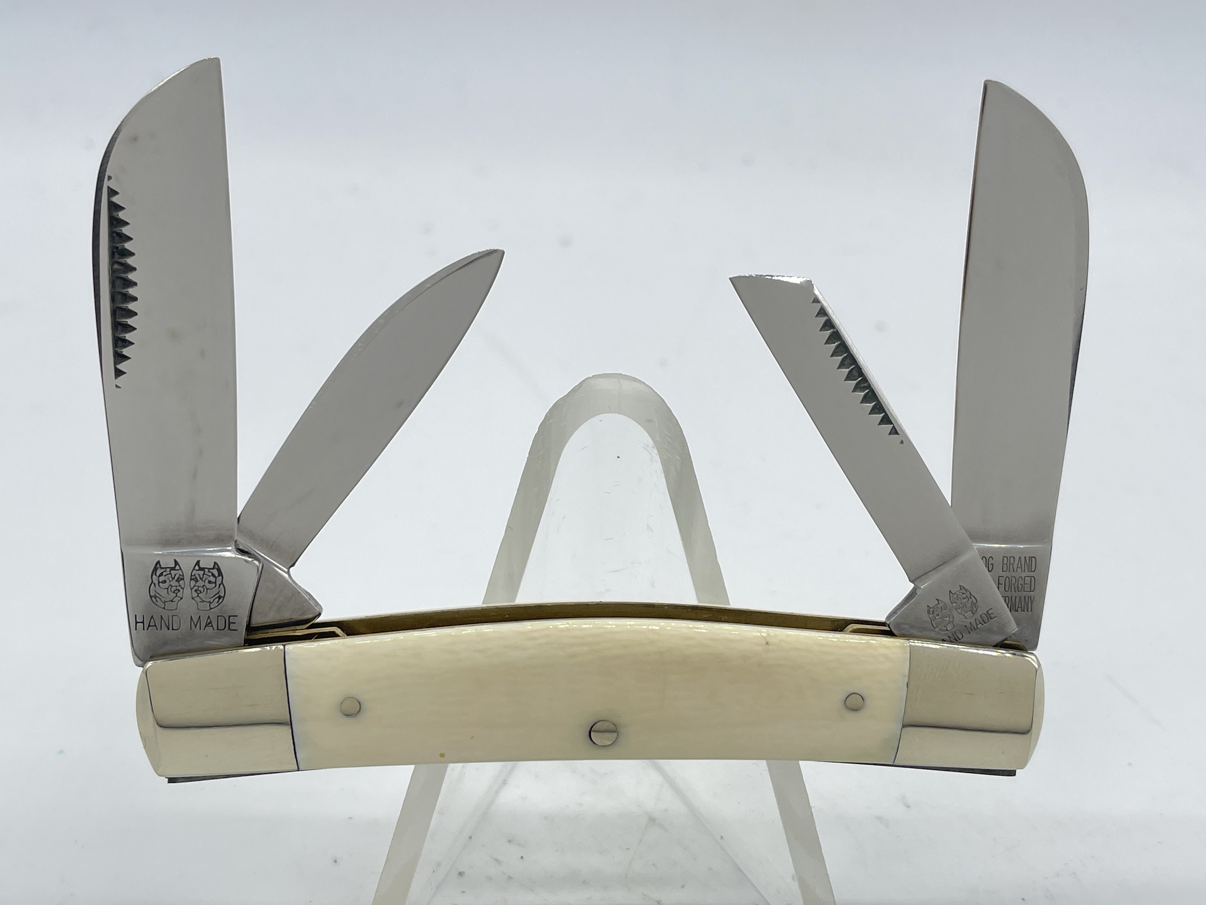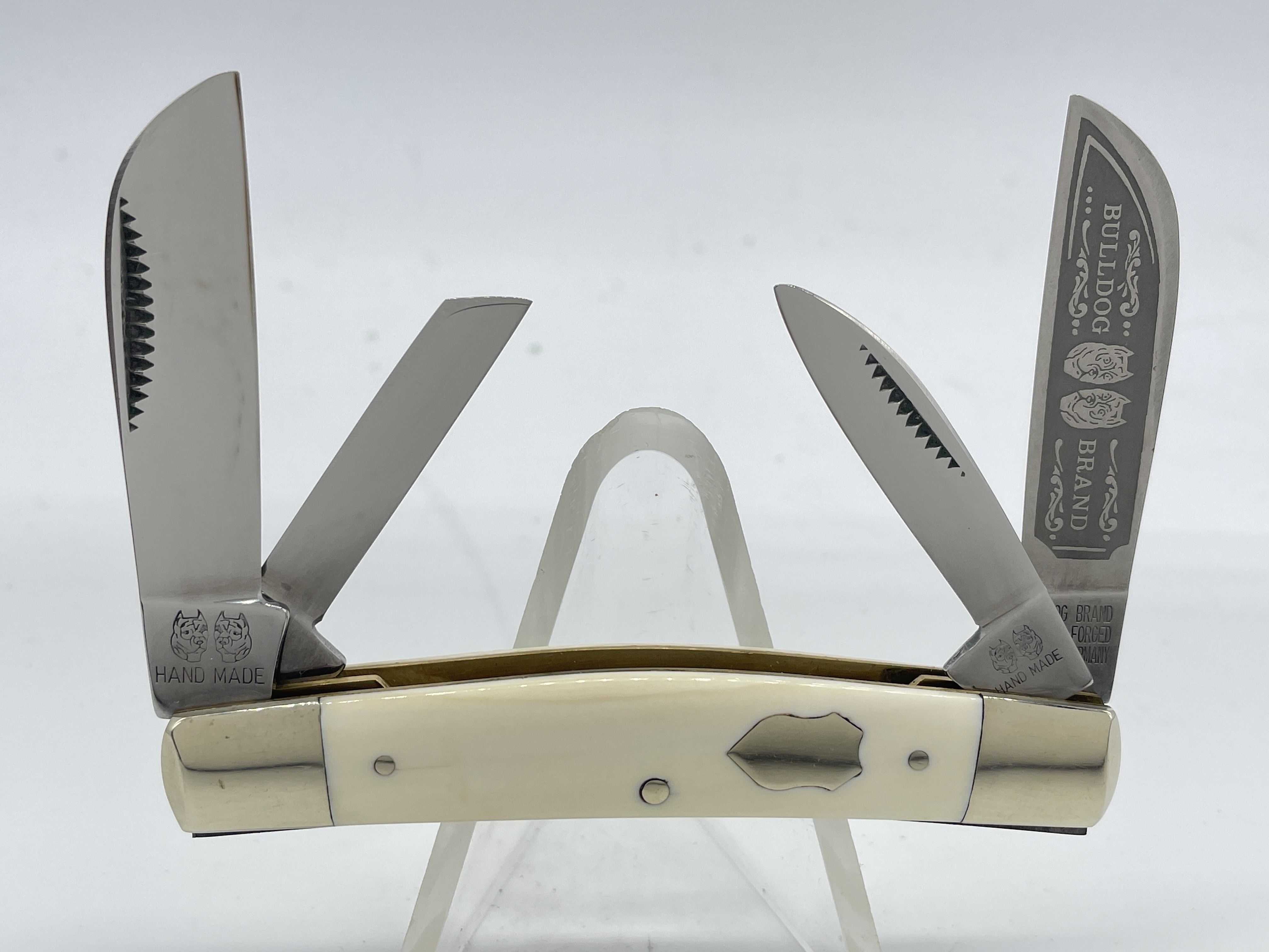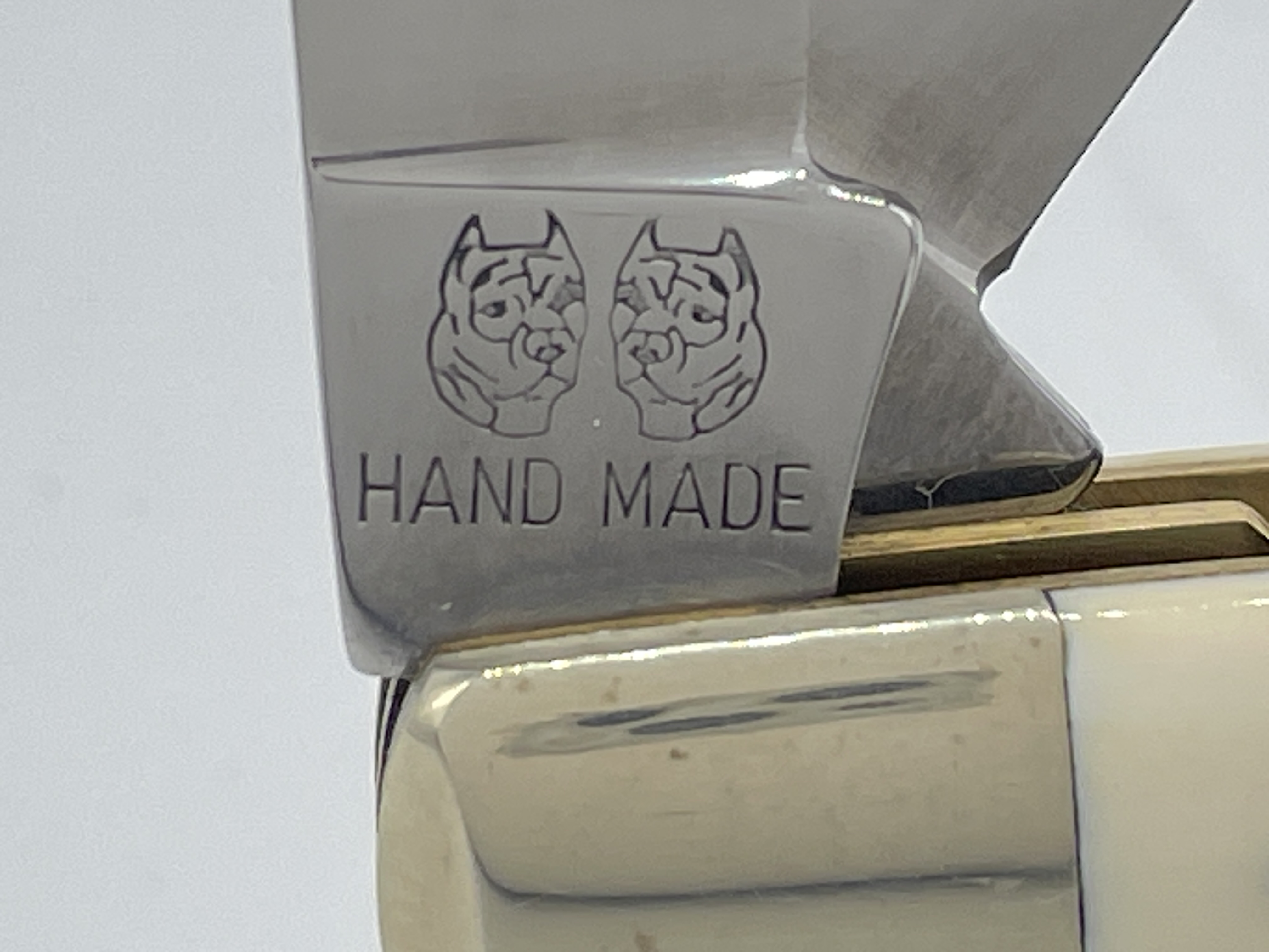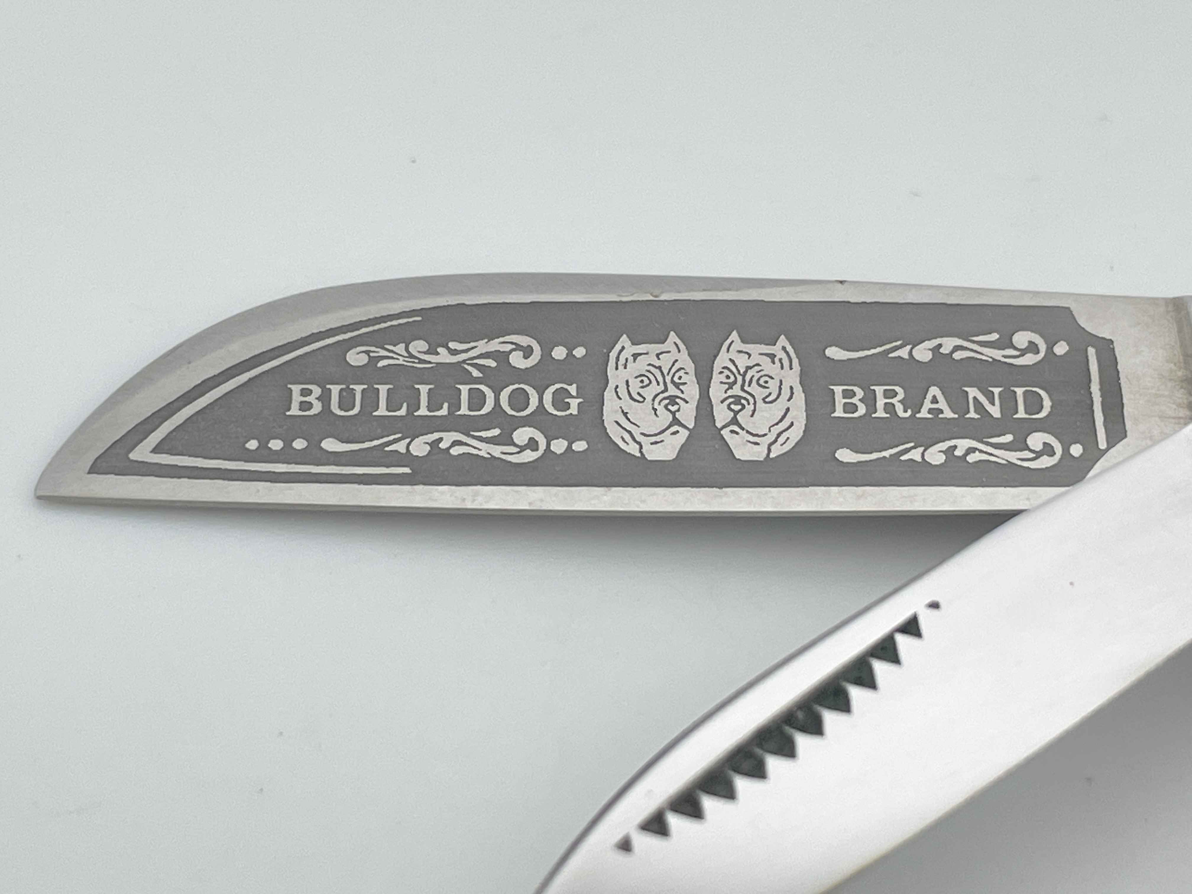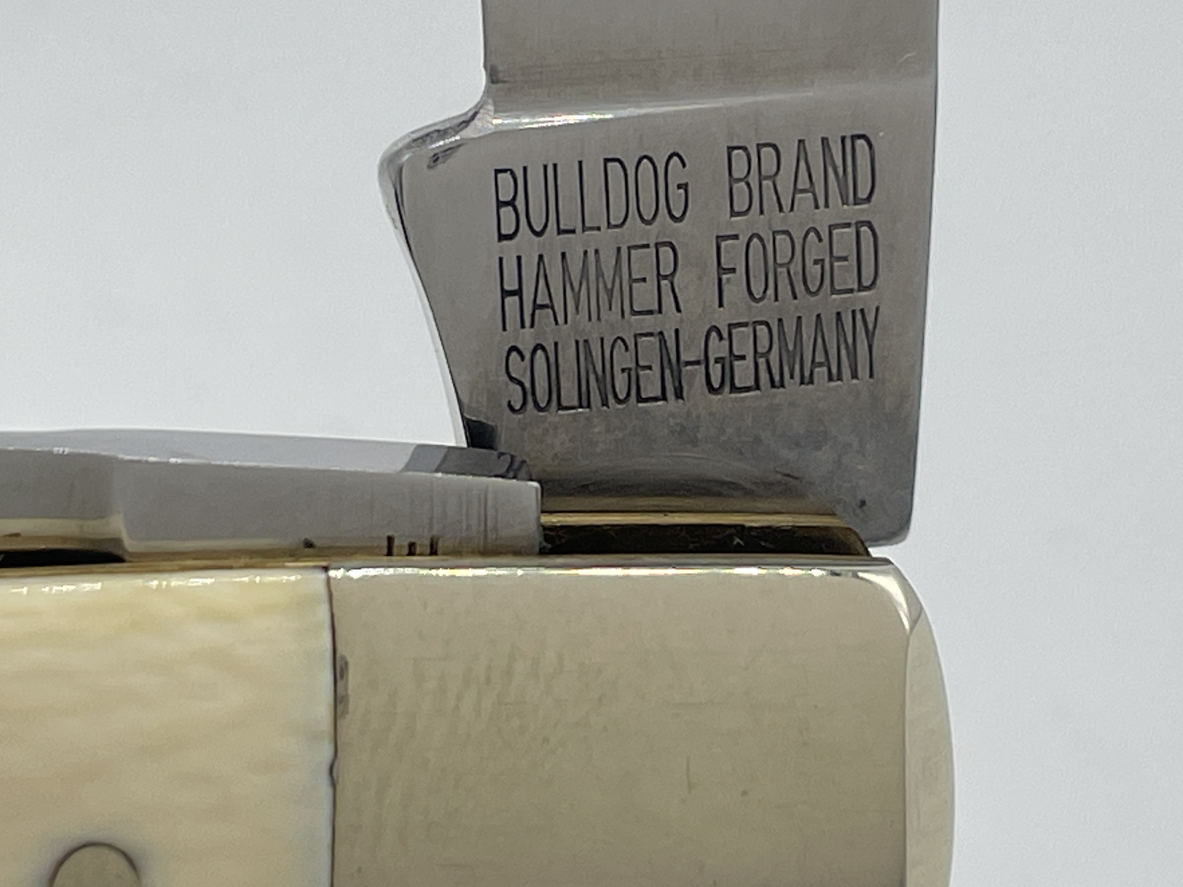 3-5/8 inches closed, 6 inches open. Made in Germany. Front tangs: 'Hand Made' with two dog heads. Rear tangs: 'Bulldog Brand Hammer Forged Solingen Germany'. Plain Badge shield. Stainless Steel blades. Rear blade 4 etch: BULLDOG (two dog heads) BRAND. Genuine Mastodon Ivory handles. Nickel silver bolsters. Brass liner.