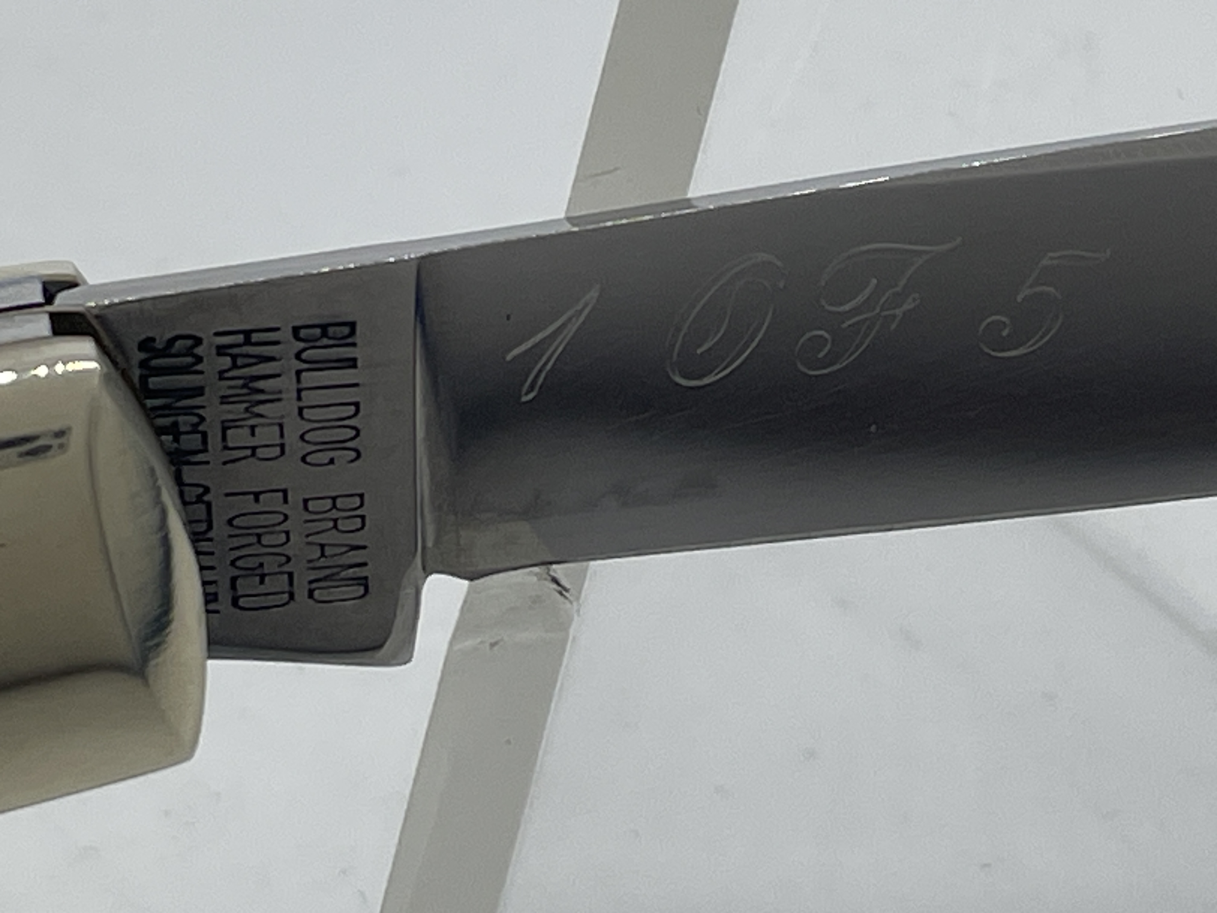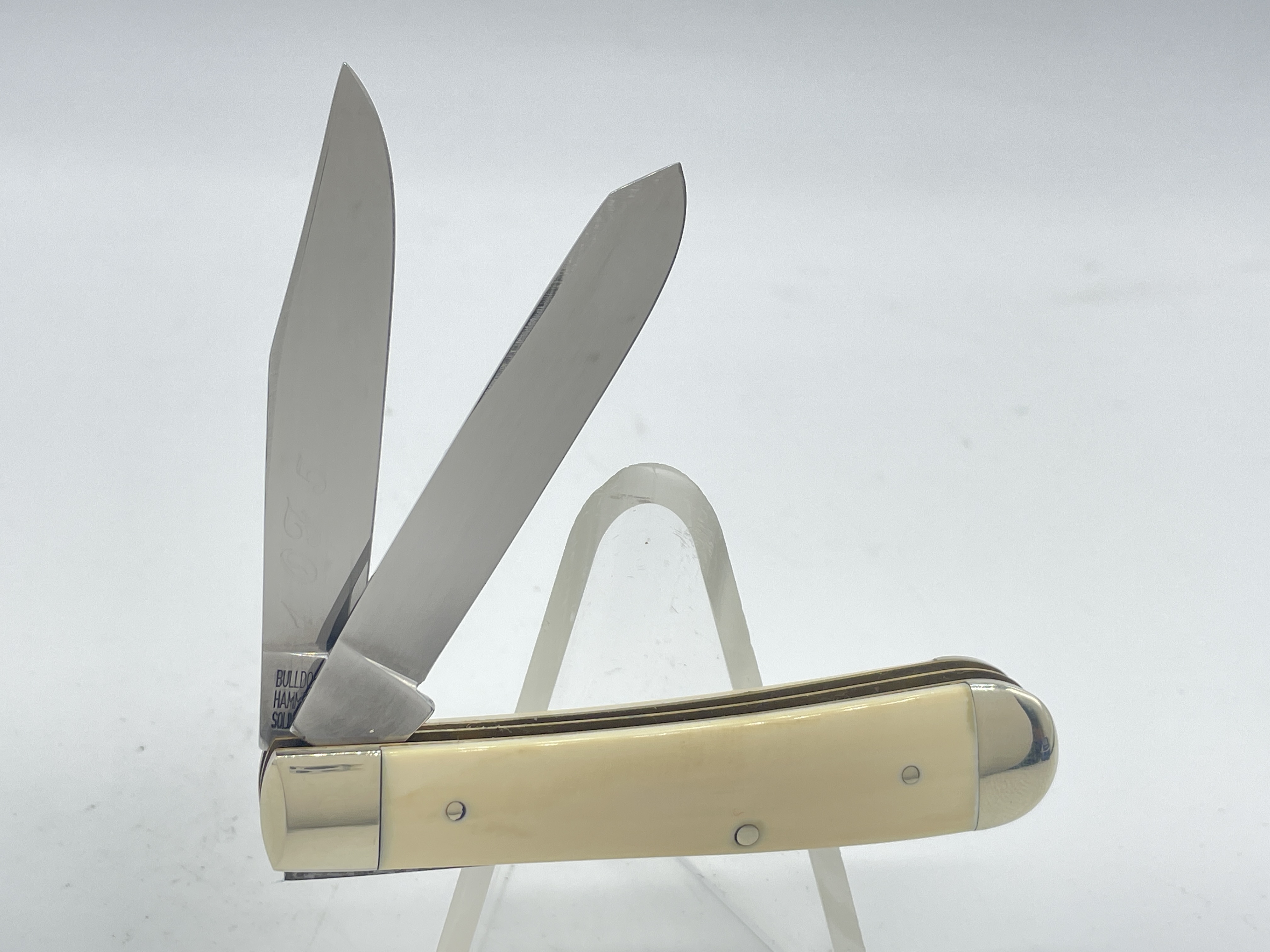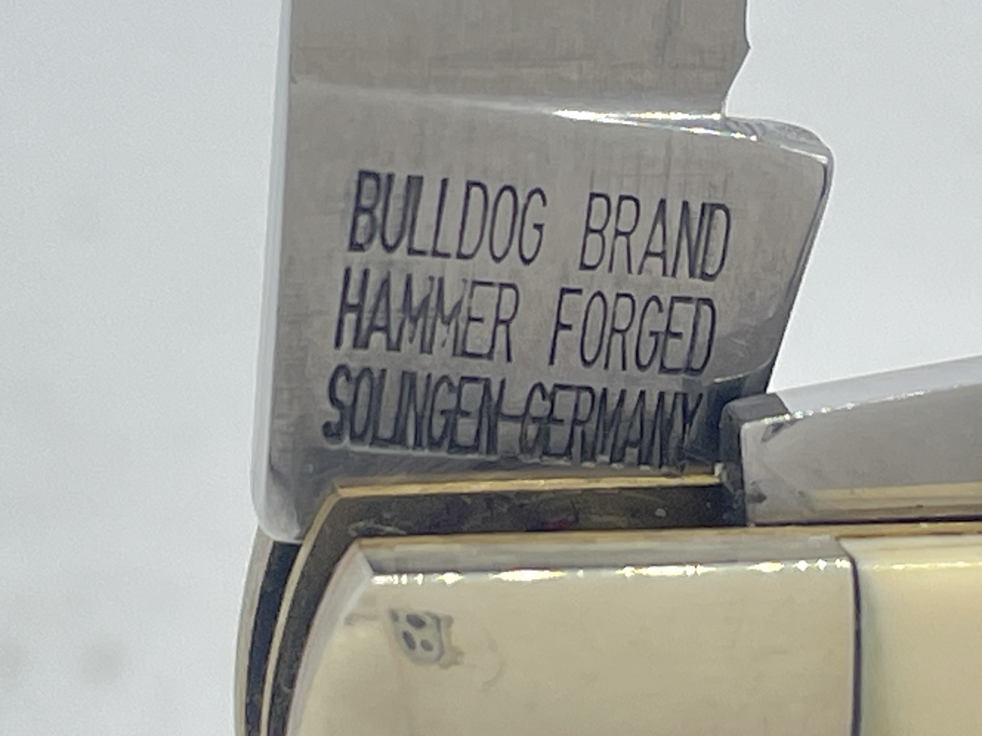 3-1/4 inches closed. 5-7/8 inches open. Made in Germany. Front Tangs: (Bulldog Heads Logo) HAND MADE ; Rear Tang Master Blade: BULLDOG BRAND HAMMER FORGED SOLINGEN GERMANY. Stainless Steel blades. Rear Master blade etched with 1 of 5. Genuine Mastodon Ivory handle. Nickel Silver bolsters. Brass liner.