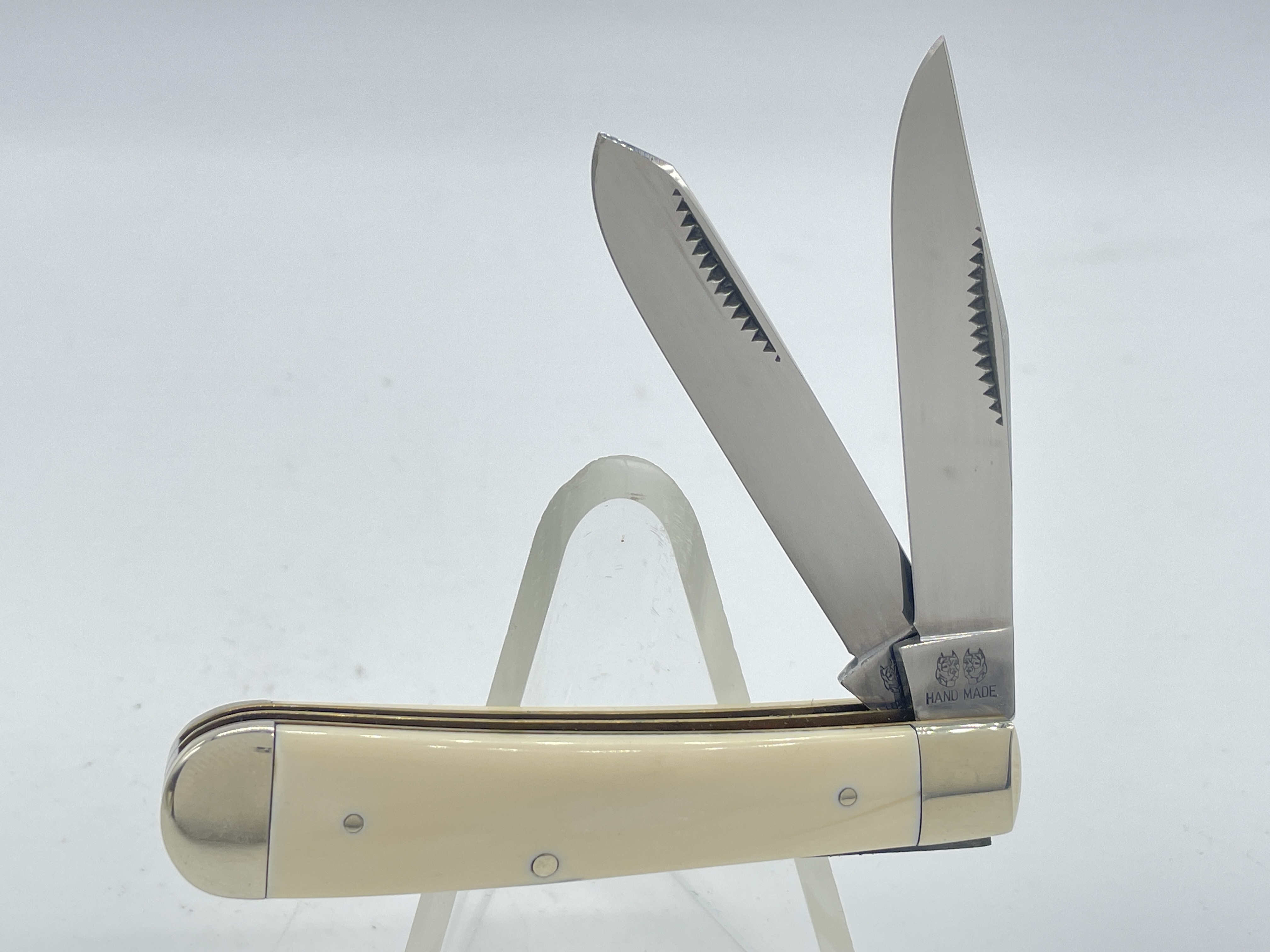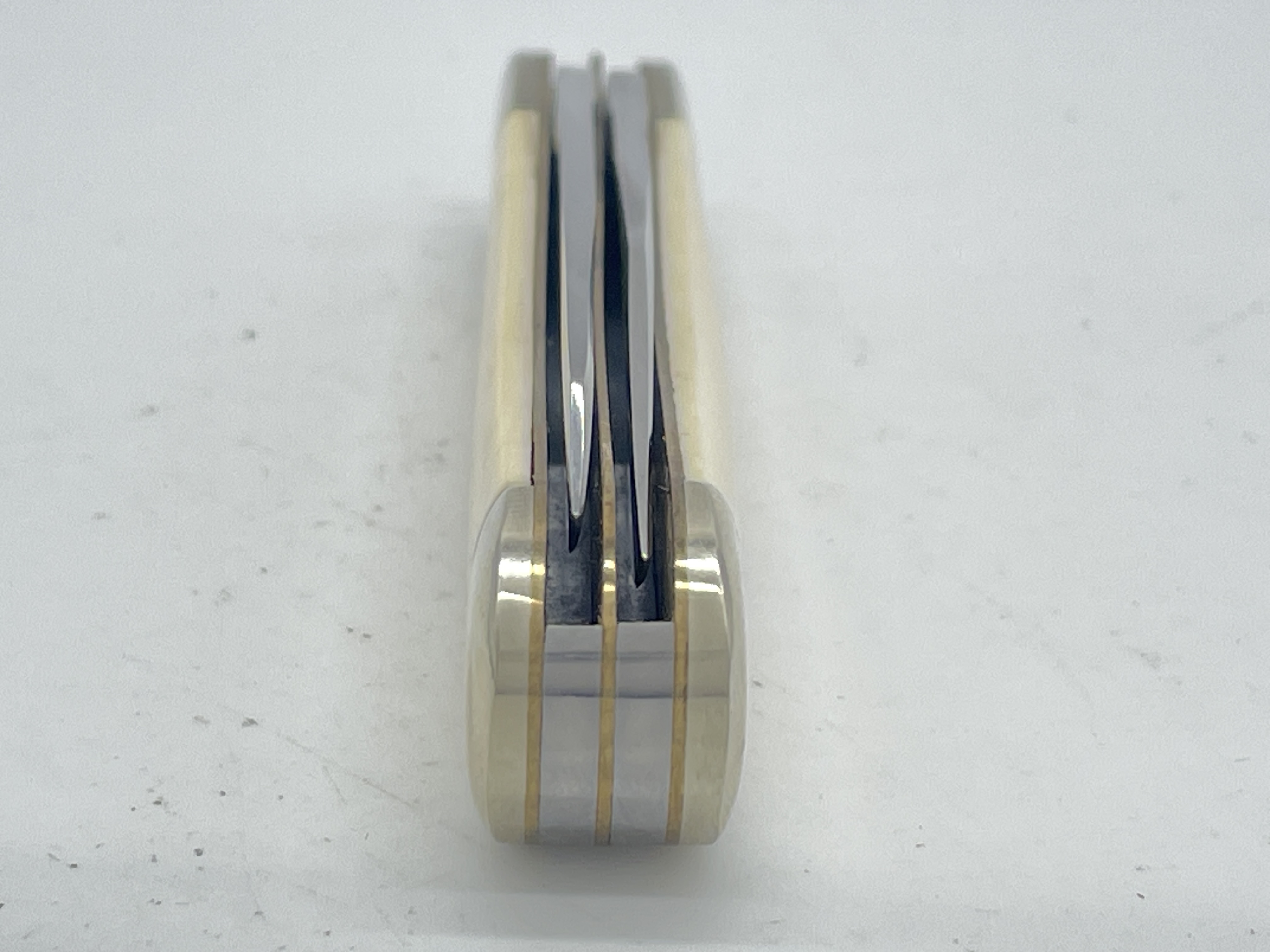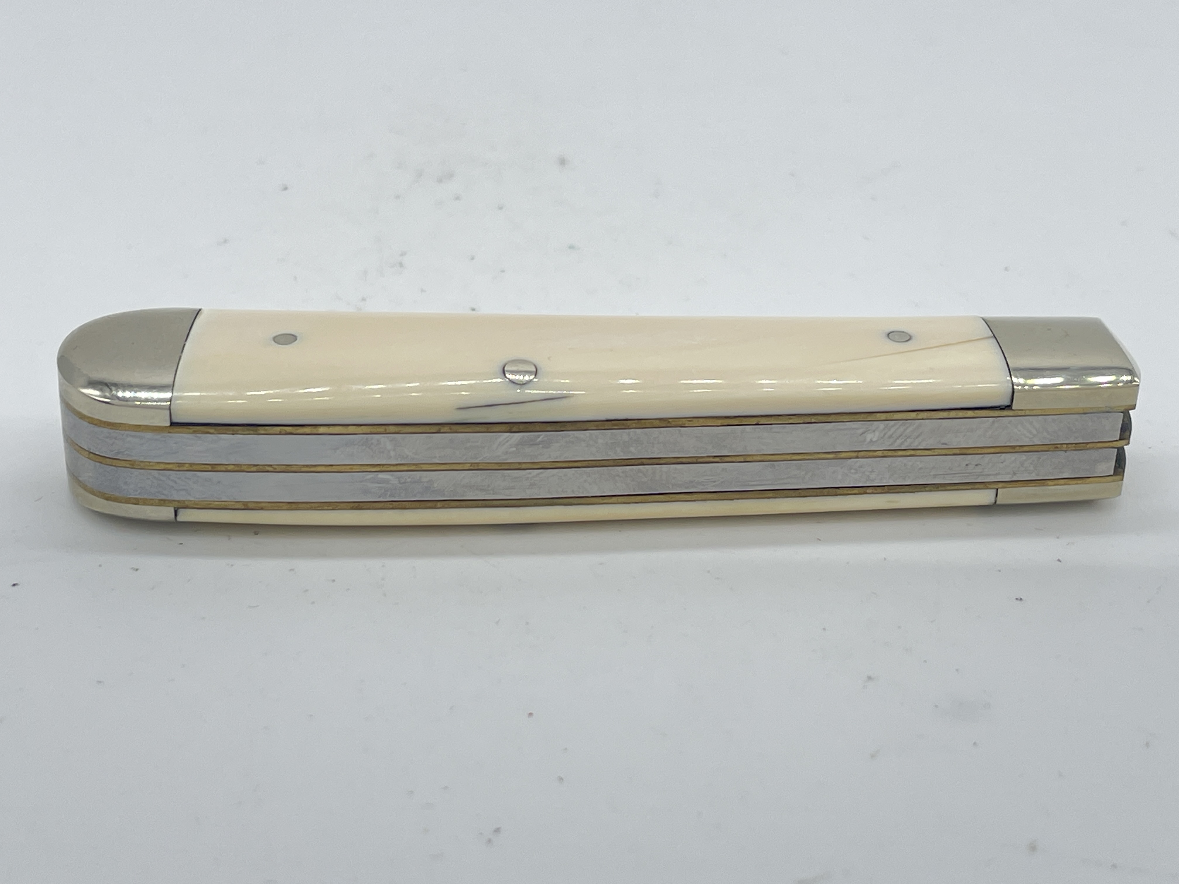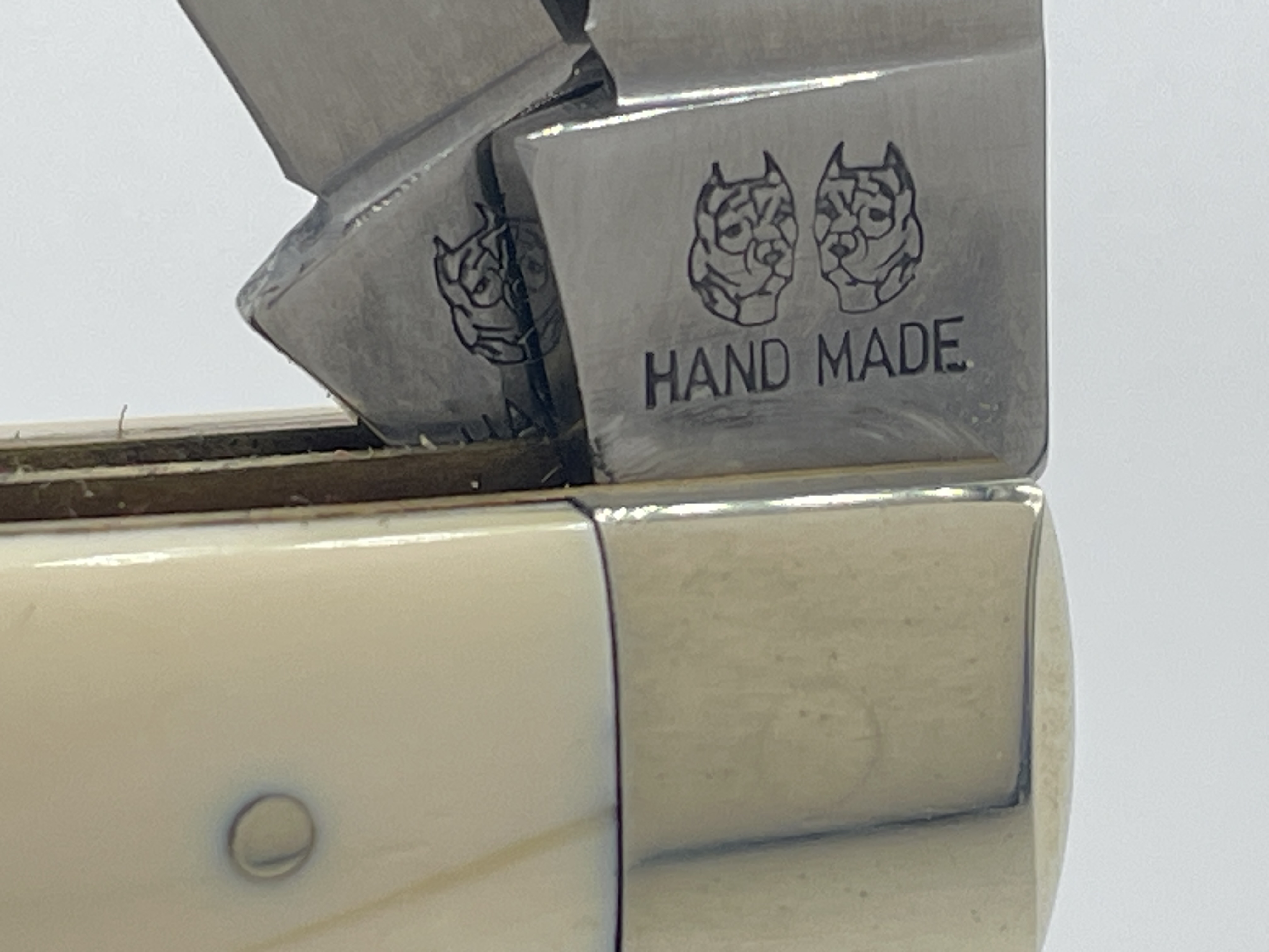 3-1/4 inches closed. 5-7/8 inches open. Made in Germany. Front Tangs: (Bulldog Heads Logo) HAND MADE ; Rear Tang Master Blade: BULLDOG BRAND HAMMER FORGED SOLINGEN GERMANY. Stainless Steel blades. Rear Master blade etched with 1 of 5. Genuine Mastodon Ivory handle. Nickel Silver bolsters. Brass liner.