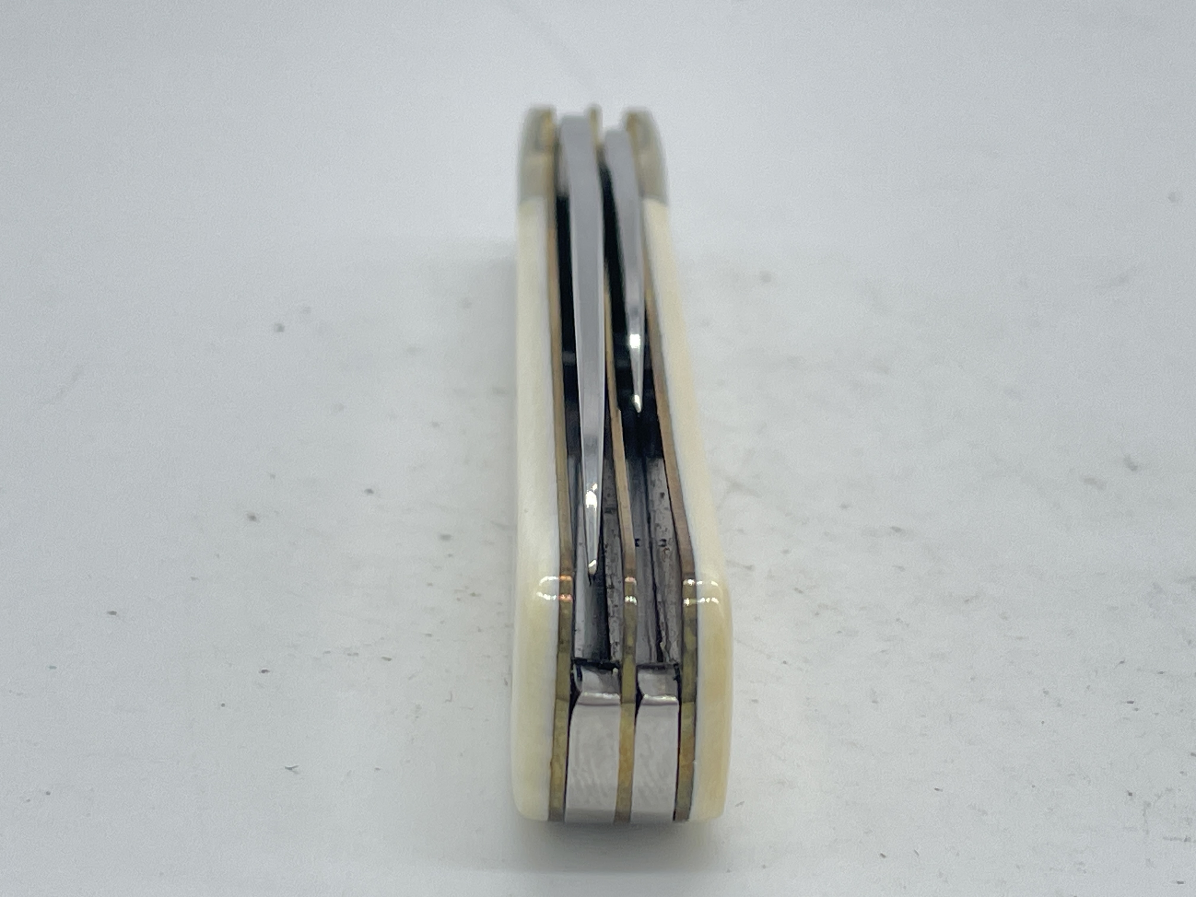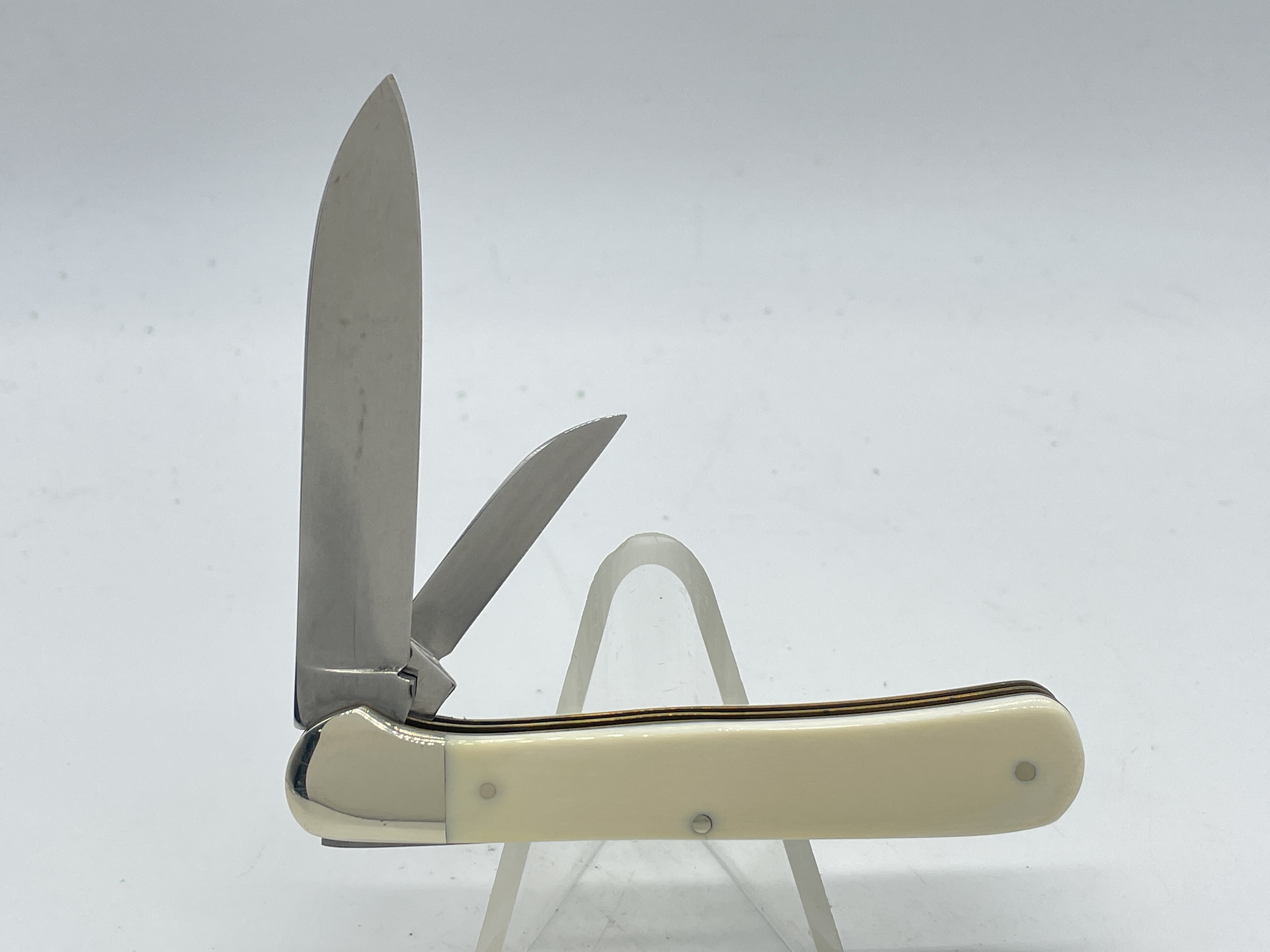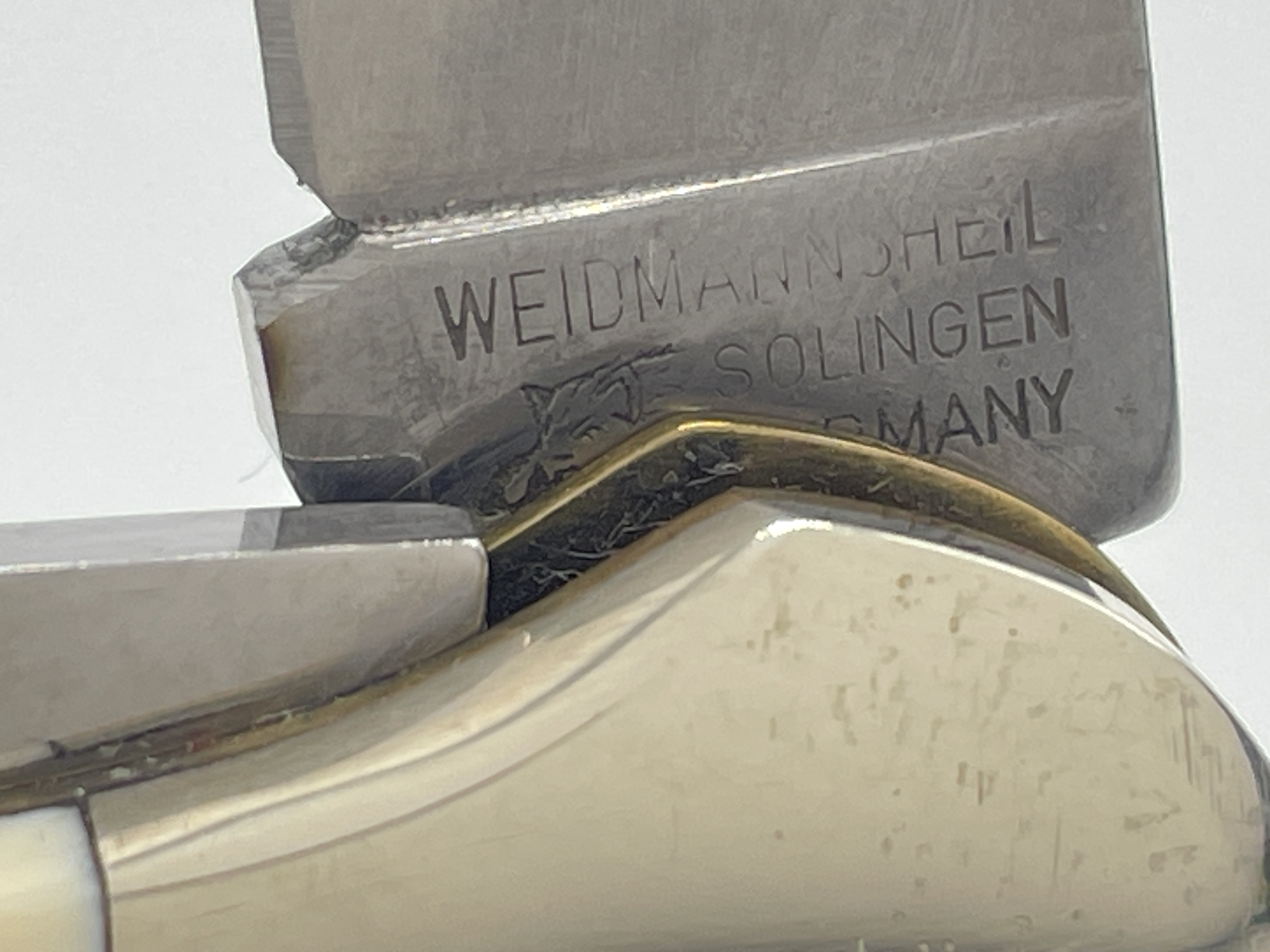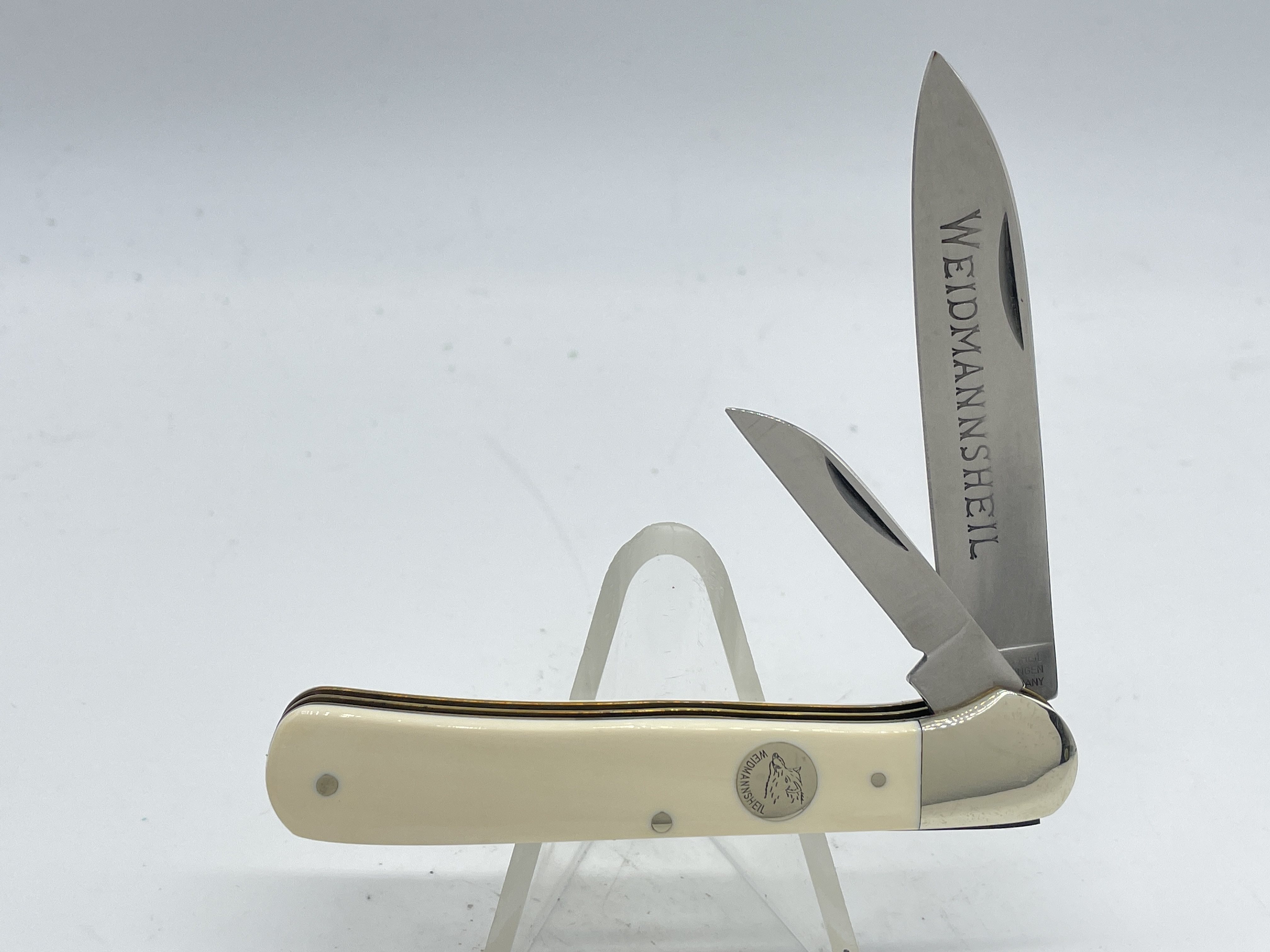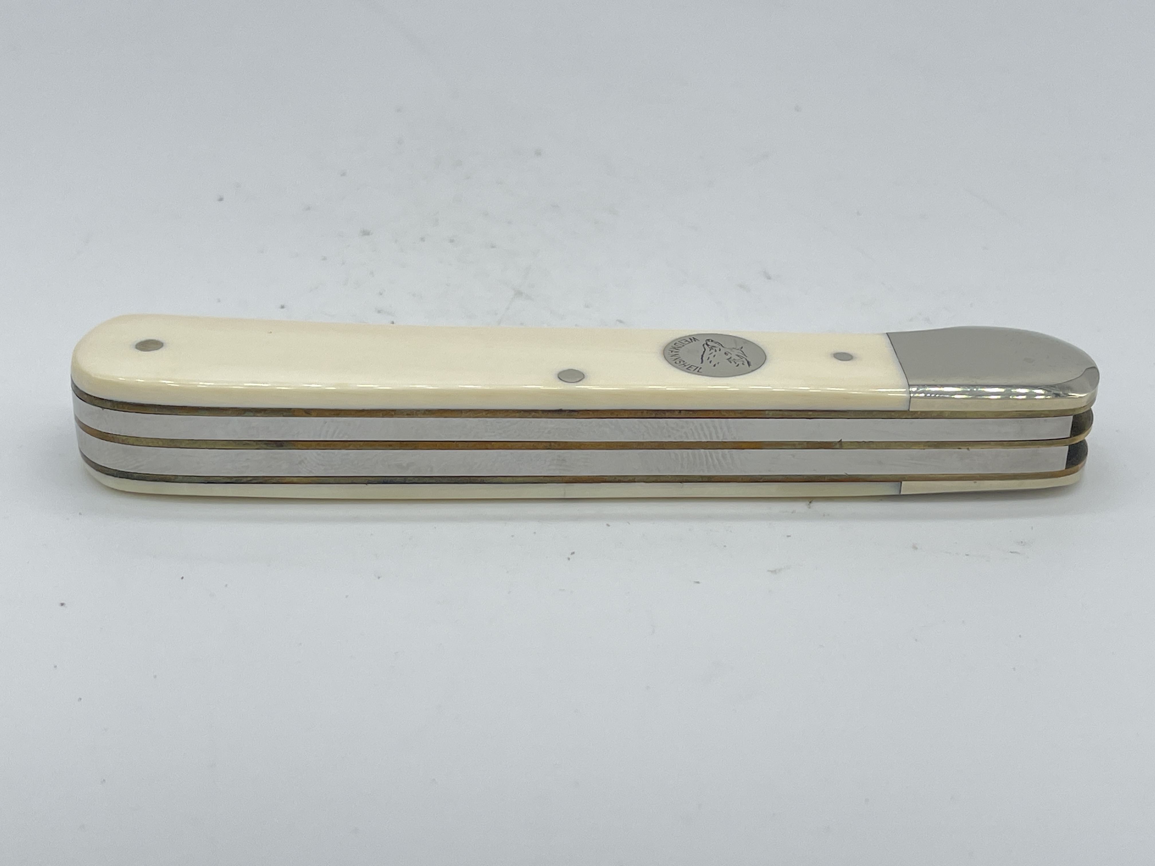 4-1/8 inches closed. 7-1/4 inches open. Made in Germany. Front Tang Master Blade: WEIDMANNSHEIL (Boar Head) SOLINGEN GERMANY. WEIDMANNSHEIL (Boar Head) Circle shield. Steel blades. Front Master Blade etch: WEIDMANNSHEIL. Genuine Antique Ivory handle. Nickel Silver bolster. Brass liner.