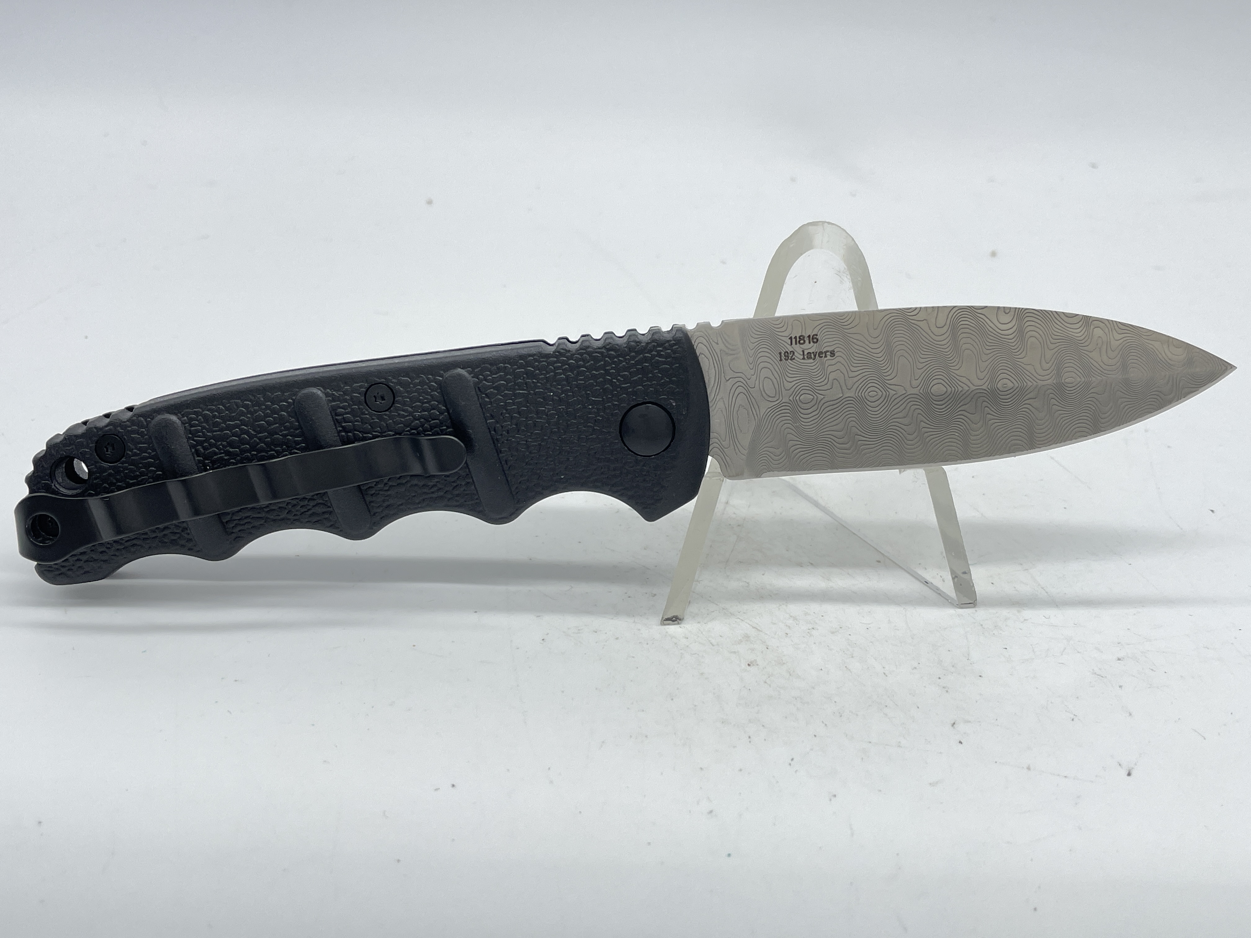 4-1/4 inches closed. 7-5/8 inches open. Made in Taiwan. Front Tang: BOKER PLUS. Damascus Steel Drop Point Blade. Front blade etch: AUTOMAT KALASHNIKOV 74 ; Rear blade etch: 11816 192 Layers. Black Anodized Aluminum handle. Push-button lock and steel belt clip.