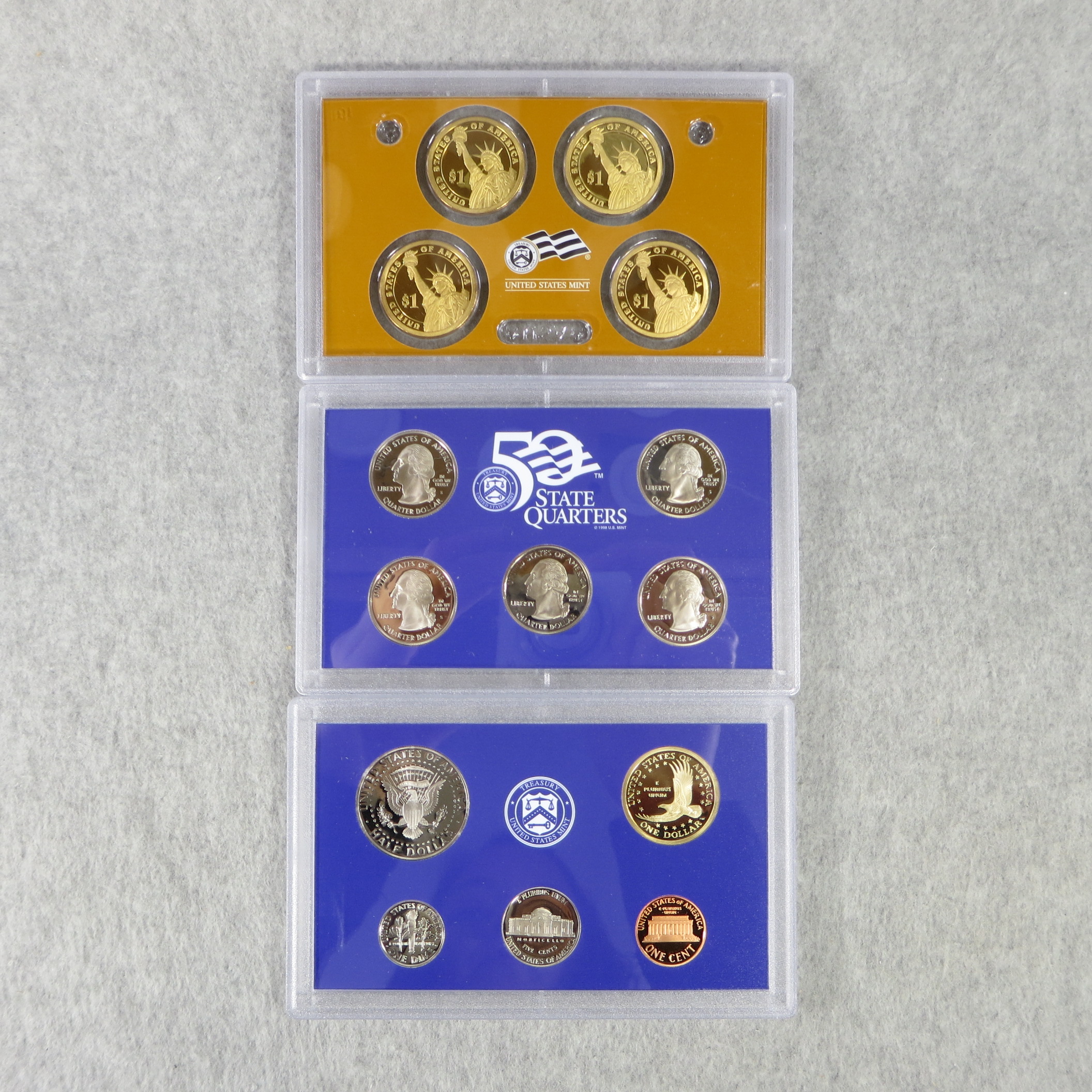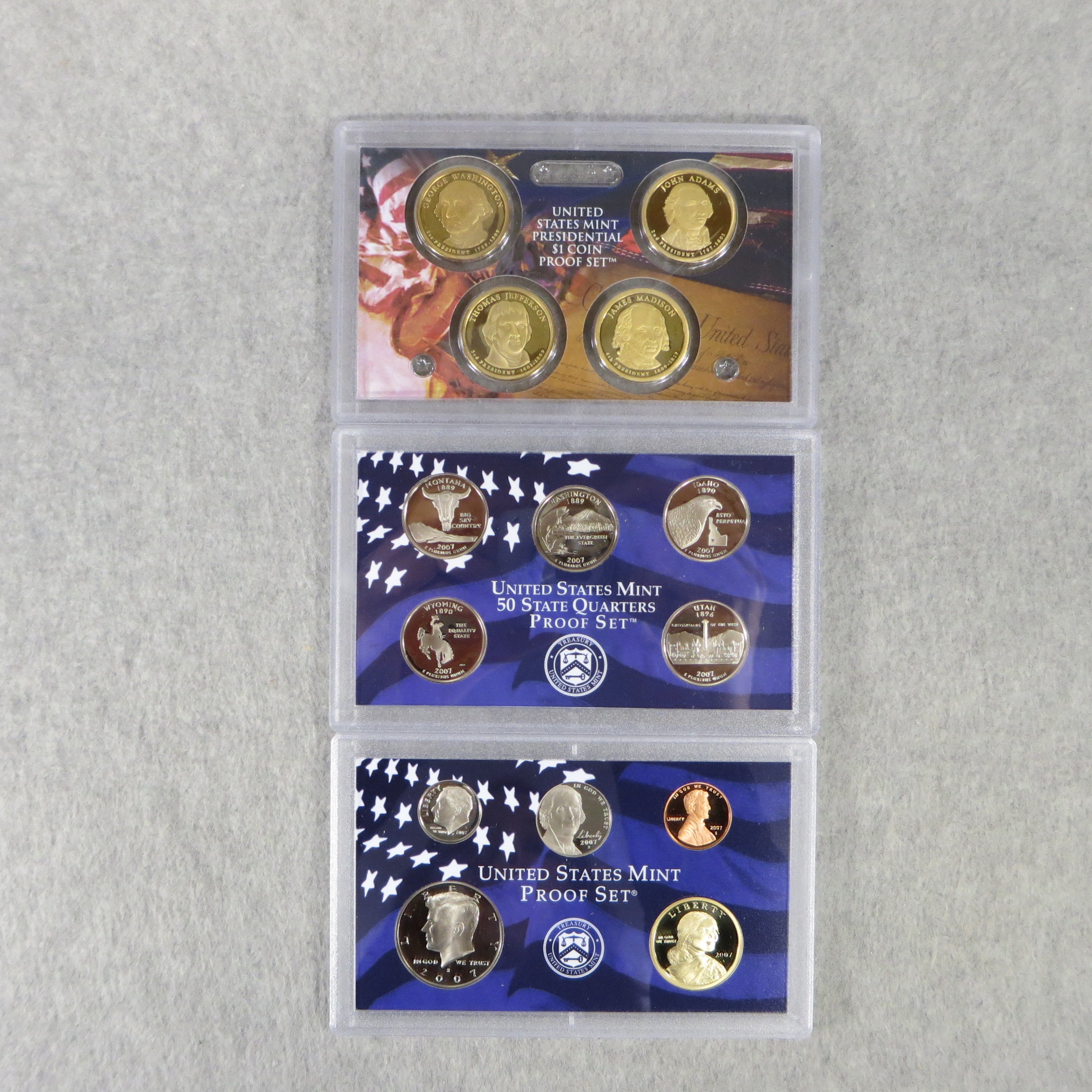 San Francisco Mint. Includes original US Mint boxes and certificates of authenticity. Coins included are 5 quarters; 1 cent, nickel, dime, Kennedy half dollar and Sacagawea dollar, 4 presidential dollars (George Washington, Thomas Jefferson, John Adams and James Madison). Total face value of this set is $6.91.