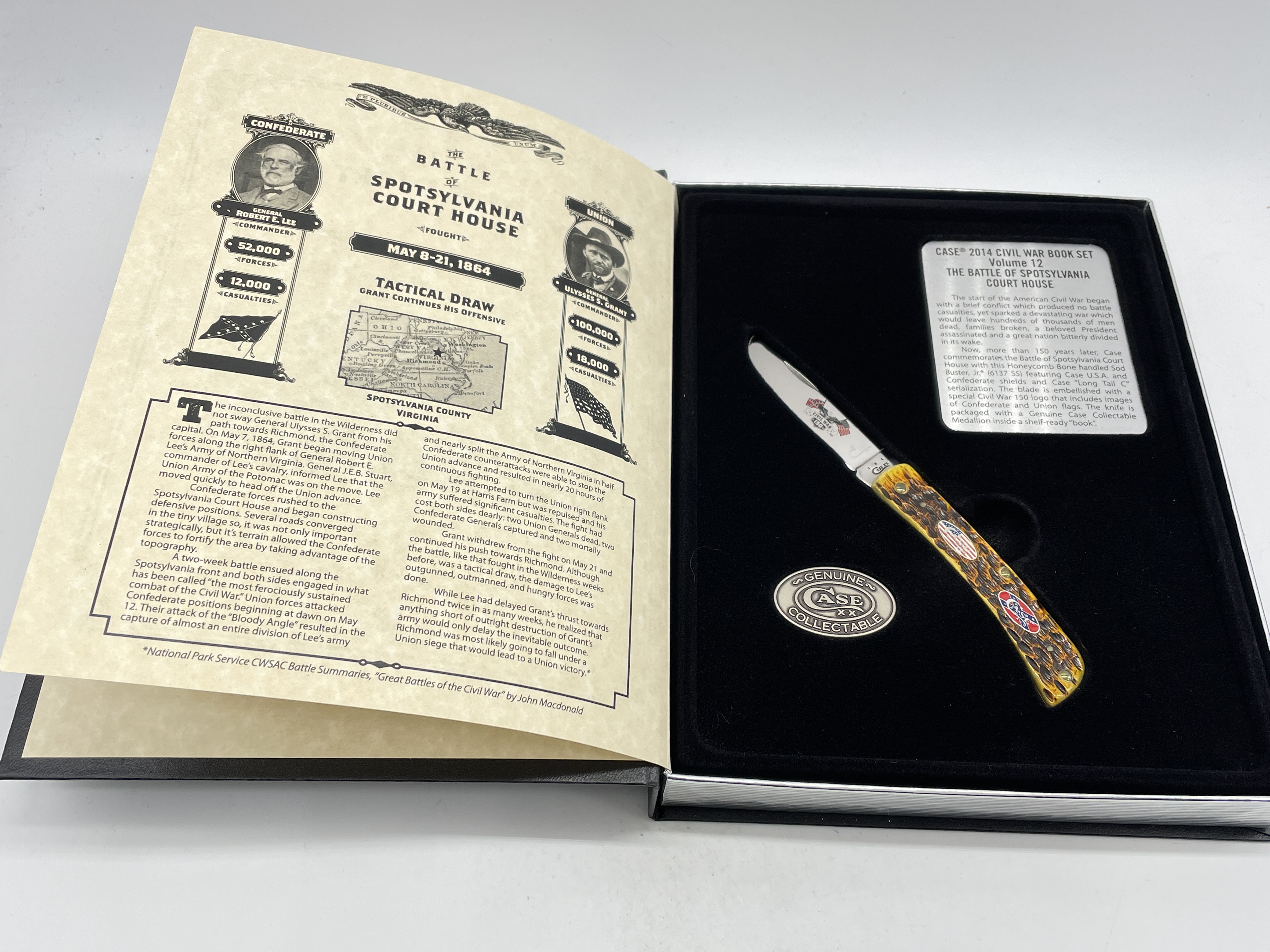 Limited Edition Volume 12: The Battle of Spotsylvania Court House. 3-5/8 inches closed. 6-3/8 inches open. Made in USA. Front Tang: x x x CASE XX x x* (Longtail-C, Lightning Bolt-S) ; Rear Tang: USA 6137 SS. Oval Case XX American Flag & Oval Case XX Confederate Flag Double shields. Stainless Steel blade. Front blade etch: Civil War 150 Logo and (Longtail-C XX) unique serial number #155. Jigged Honeycomb Bone handle. Brass liner.
